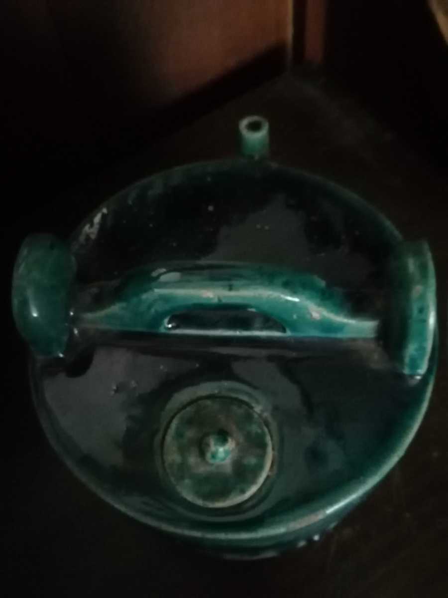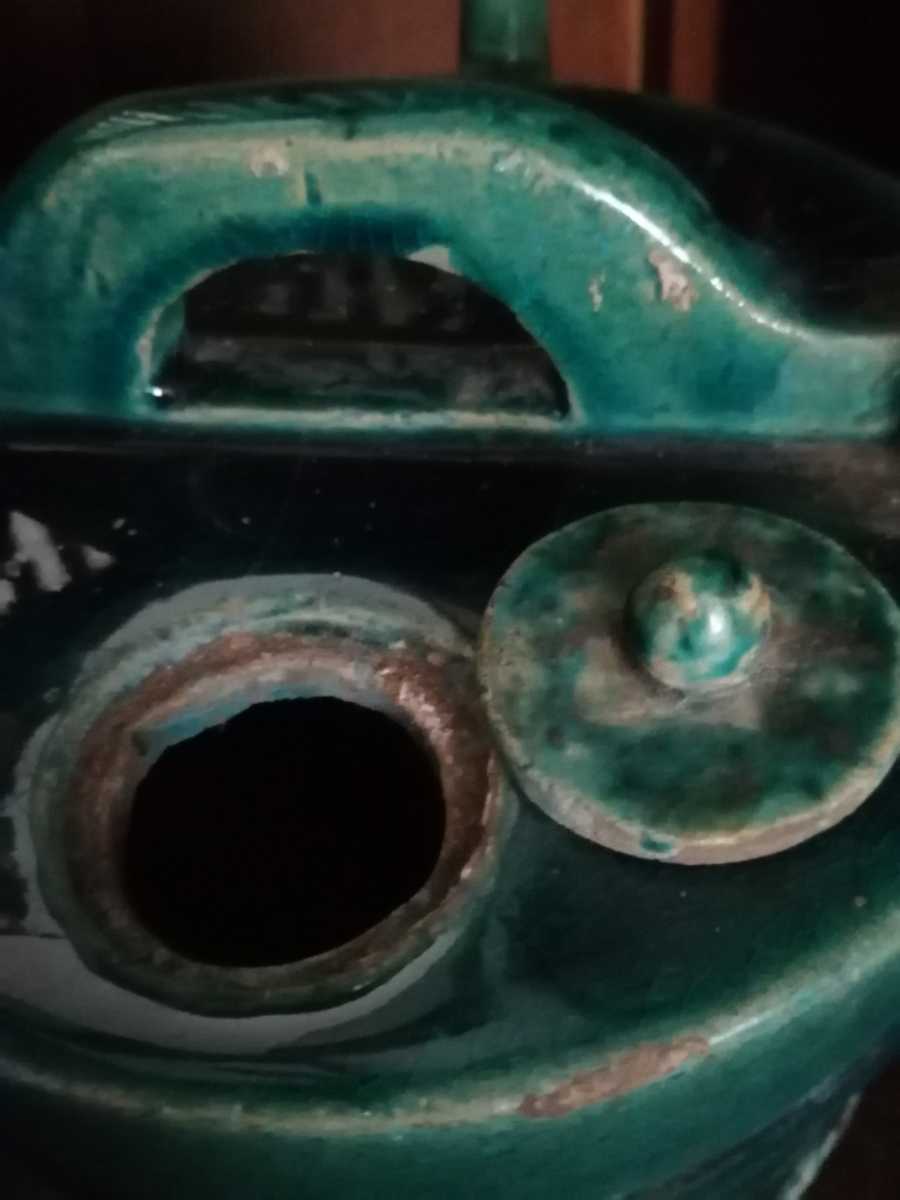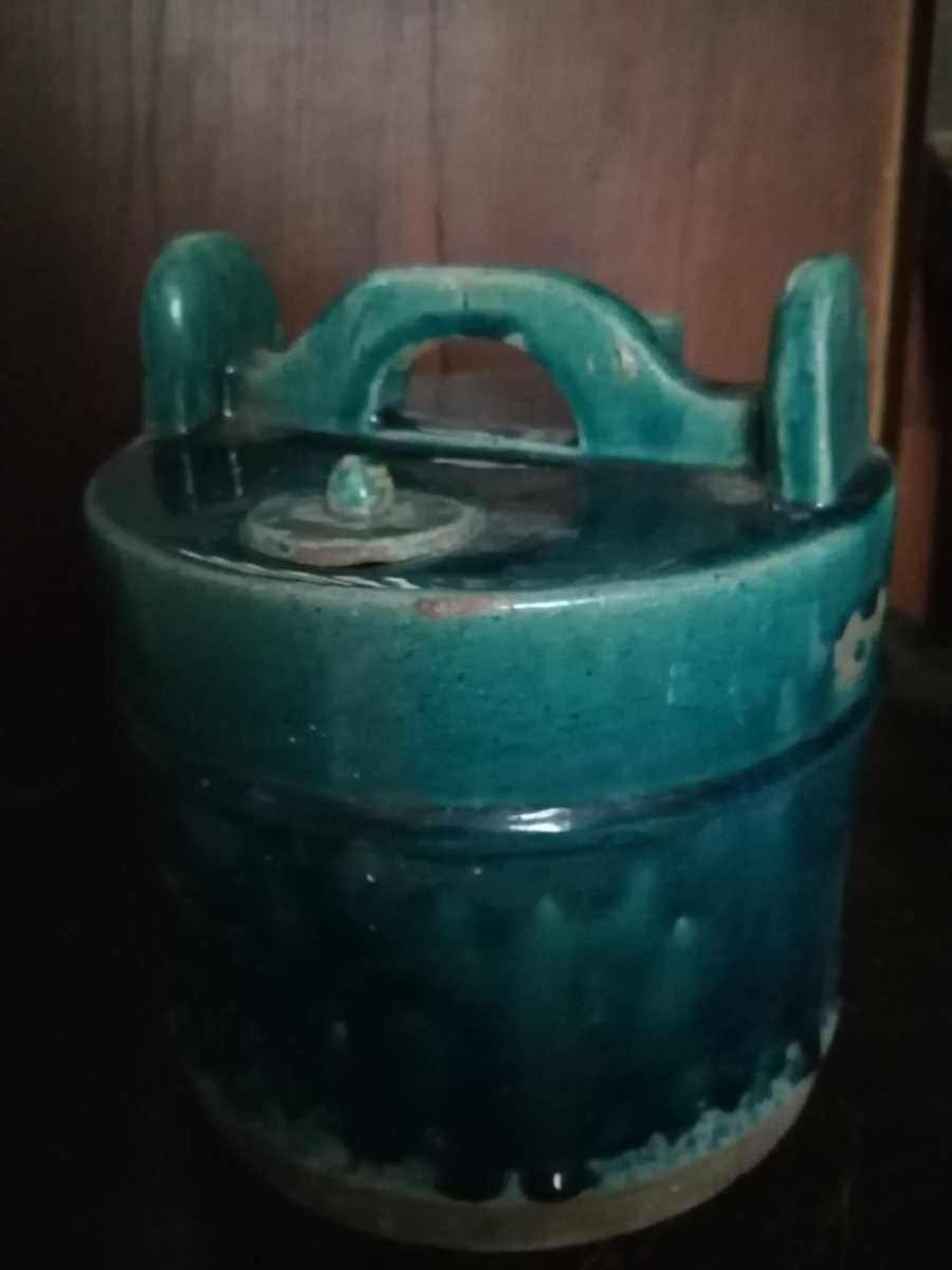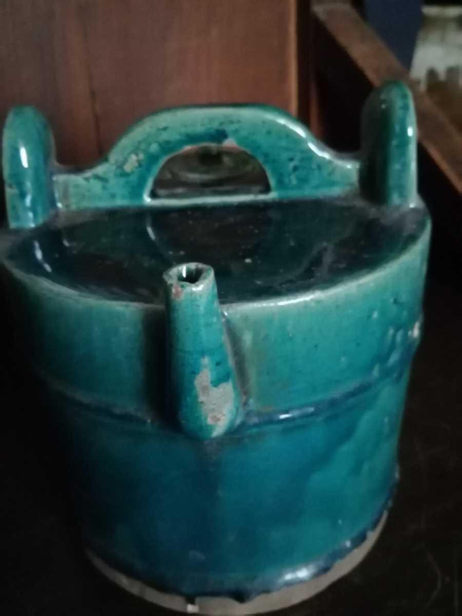 樽の型をした緑釉の酒器です。小さな注ぎ口と蓋が付いた持ち手のある形態です。古典的な古代青銅器を連想させます。16世紀頃の南方中国広東辺りの製品と思われます。緑釉の上がりが良くキズの少ない酒器です。