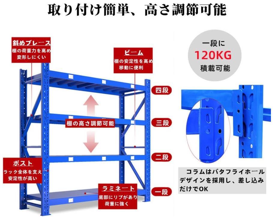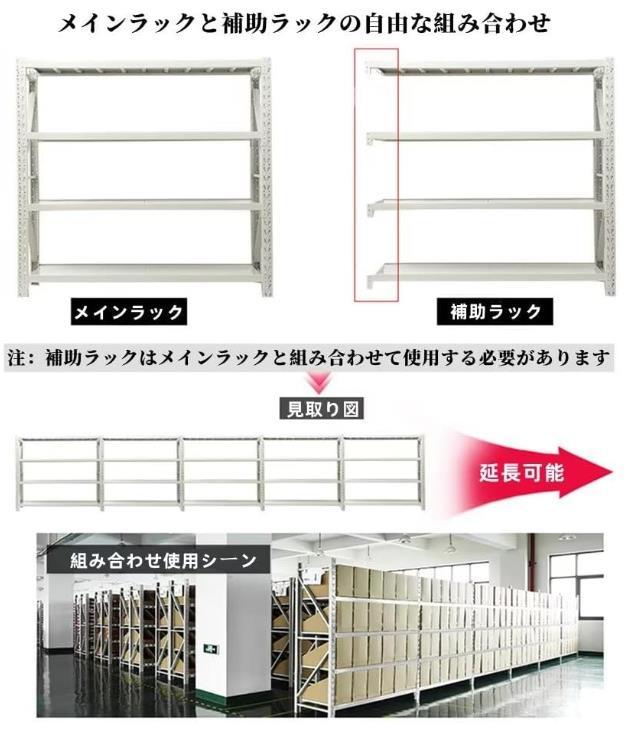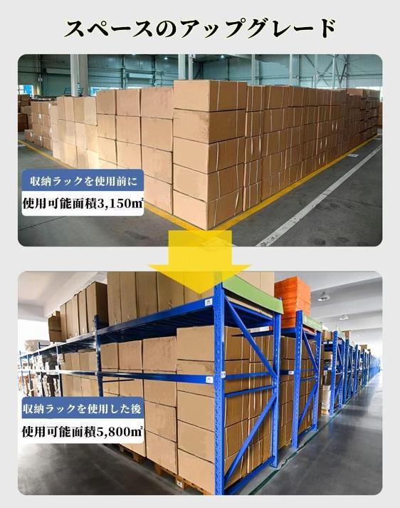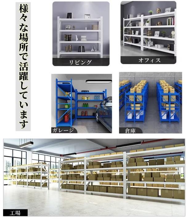「使用場所」業務用スチールラックとして倉庫の荷物預かり、工場の物品置き場、ガレージ収納、店舗バックヤードでの保管棚、オフィスの書庫や整理棚に適しています。