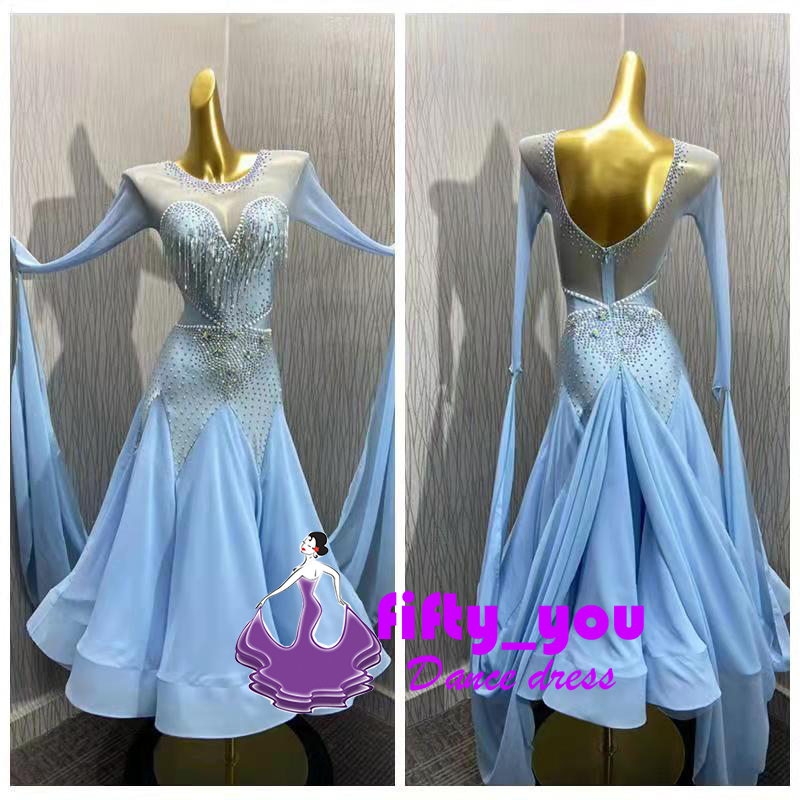 新品fifty_you ワルツ競技豪華ドレス レディース社交ダンス衣装 サイズセミオーダー モダンダンスドレス  ビーズ飾り 浅いブルー