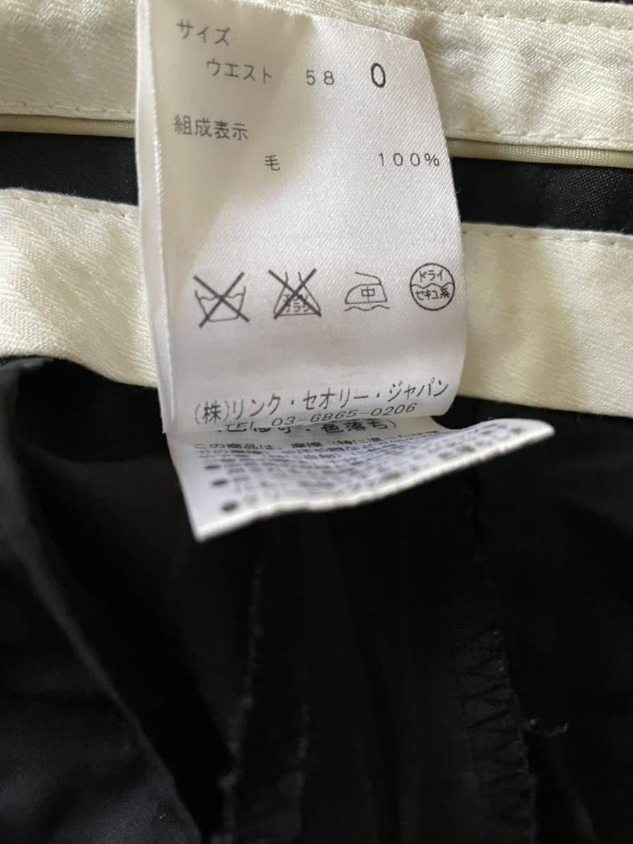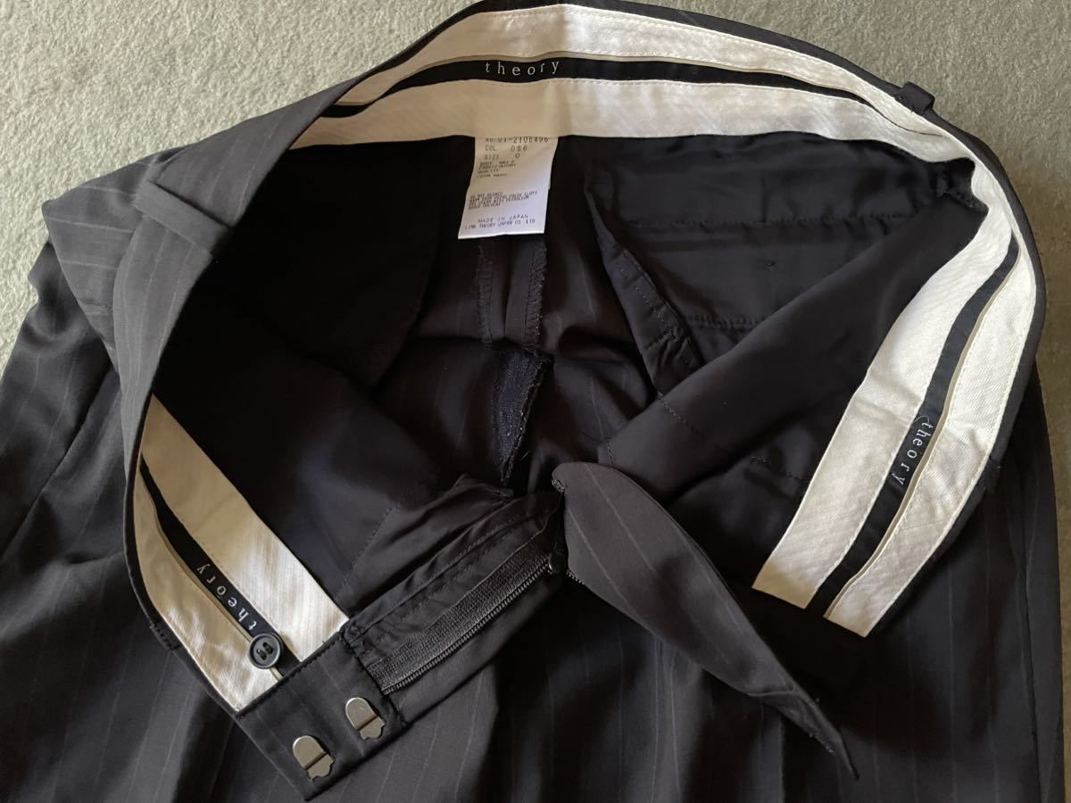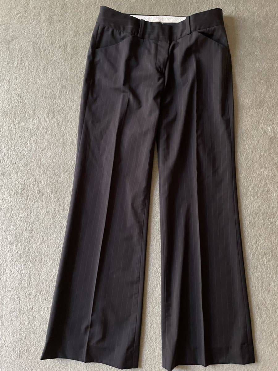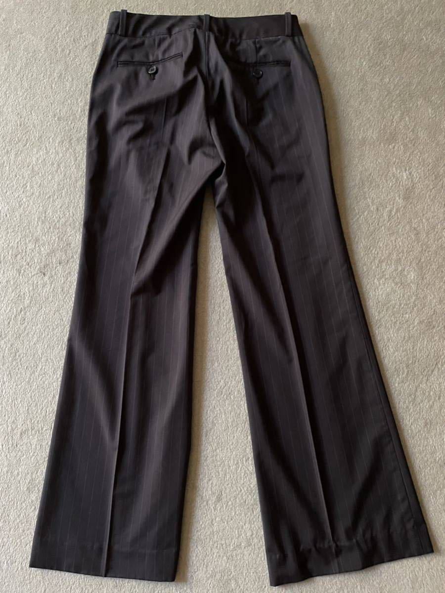 パンツサイズ0(ラベル表示はウエスト58)ウエスト36.5、ヒップ46、渡り幅27、股上22、股下71、裾幅26cm 最後の写真にあるように左ひざ部分に擦れキズあります。ブラックに近いダークブルーです