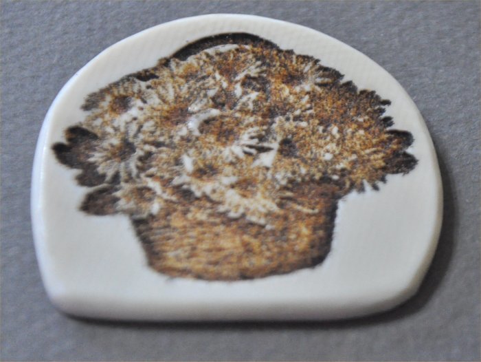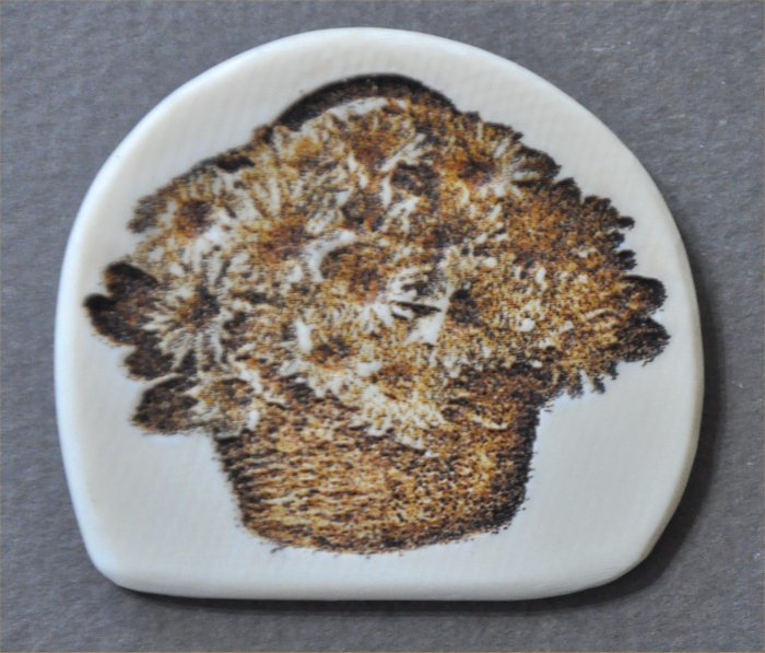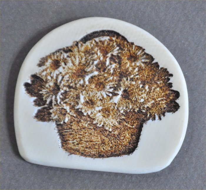 ナンタケットバスケット用のマンモス牙の花かごのレーザー彫のプレートサイズは50mm×44mm厚み5mm磨き仕上げマンモス牙のプレートにレーザー彫で花かごデザインを彫りました。