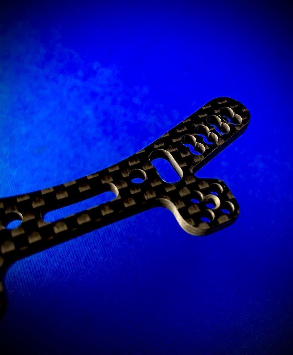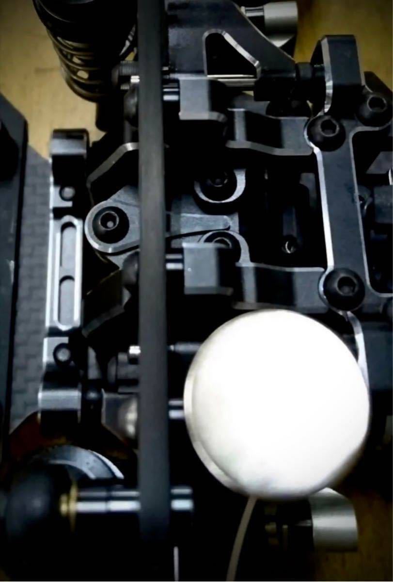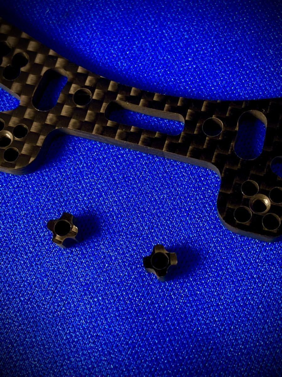アッパーアームシャフト部分のシャフトをネジで抑える部分は専用のスペーサーを3mmカーボンで削りだして、ダンパーステー側の穴にM2.5のネジ切りをしまして固定するように製作しましたので別途でM2.5のネジをご用意して取り付けお願い致します。