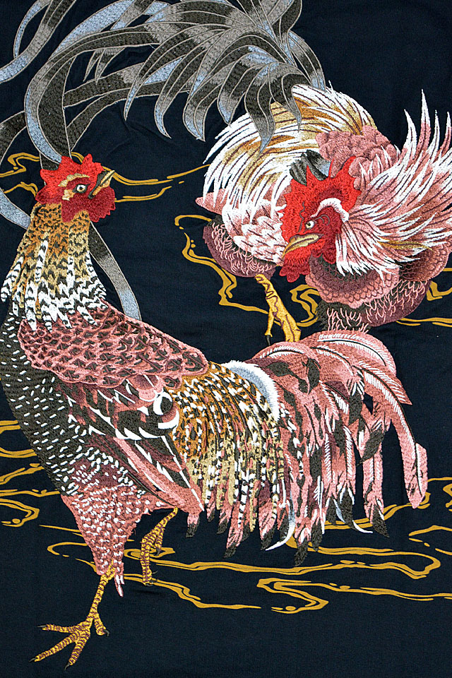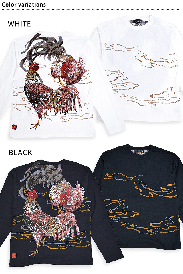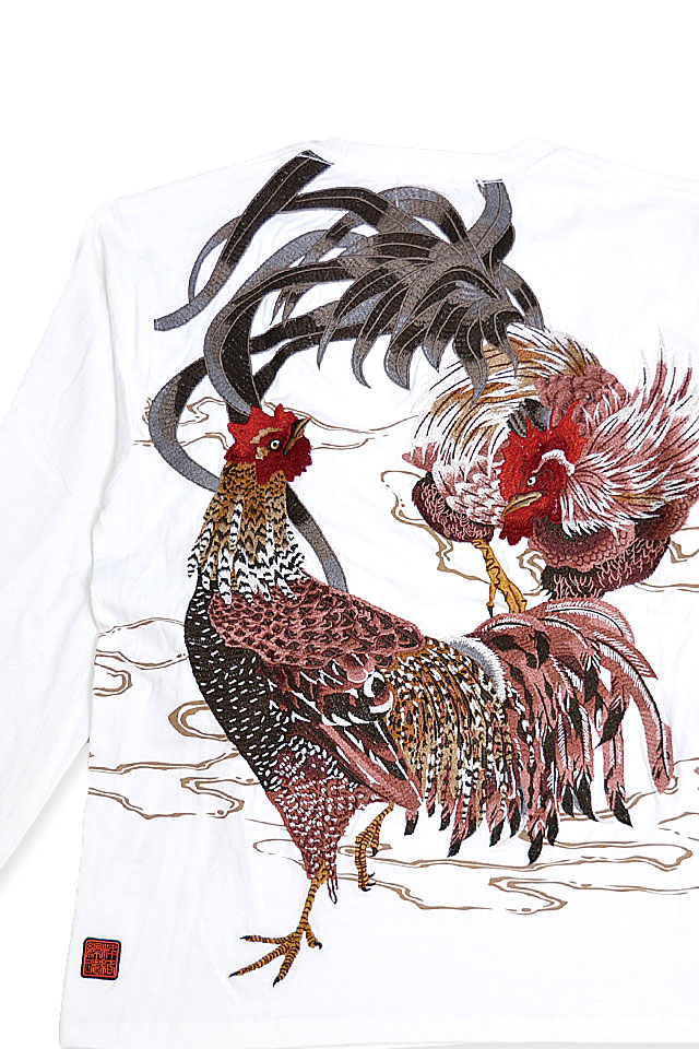 絡繰魂さんから、粋「群鶏図-若冲-」浮世絵ロングTシャツ(233078)のご紹介です。 絡繰魂の粋シリーズから最新作が登場。 今回も重みを感じるほどの刺繍量が魅力的です。 有名な伊藤若冲の群鶏図をモチーフにした長袖Tシャツです。 背中には、二羽の鶏を刺繍でデザインしました。 裾にはブランドロゴを印風に刺繍。 背景にはプリントを採用し、奥行きのある図案に仕上げました。 ボディーには綿100%の、刺繍に負けないコシのあるTシャツ生地を採用しています。 | |||||||||||||||||||||||||