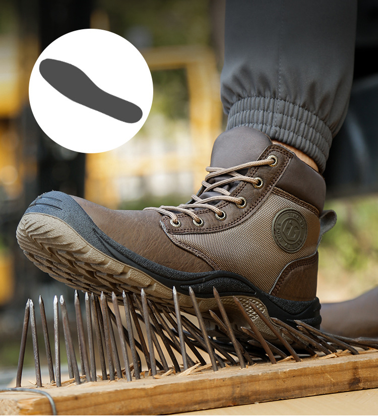 【滑り止め、爪止め】二重密度の厚みのあるラバーソールにより、ソールの耐摩耗性指数が向上し、さまざまな作業環境に簡単に対応できます。鋭利な物体(釘など)が底部を貫通するのを防ぐため、特別な底部構造が採用されています。