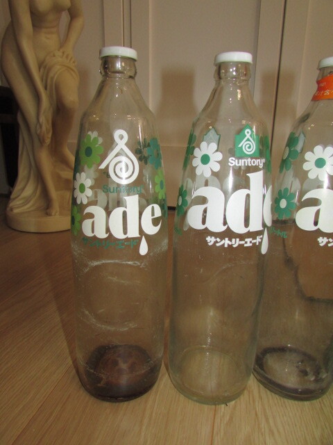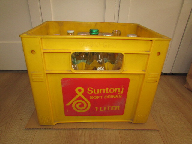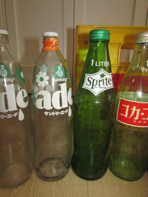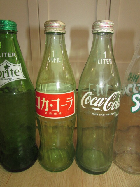 (酒屋・蔵出し)昭和レトロ(古い時代の1L空瓶・蓋付き・コカコーラ・スプライト・キリンレモンなど6種10本・ケース付)貴重・珍品