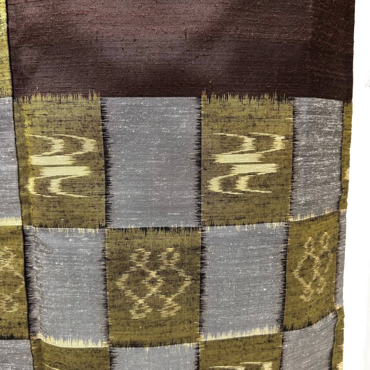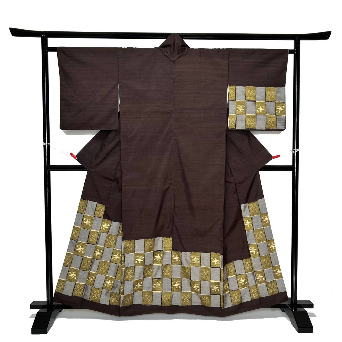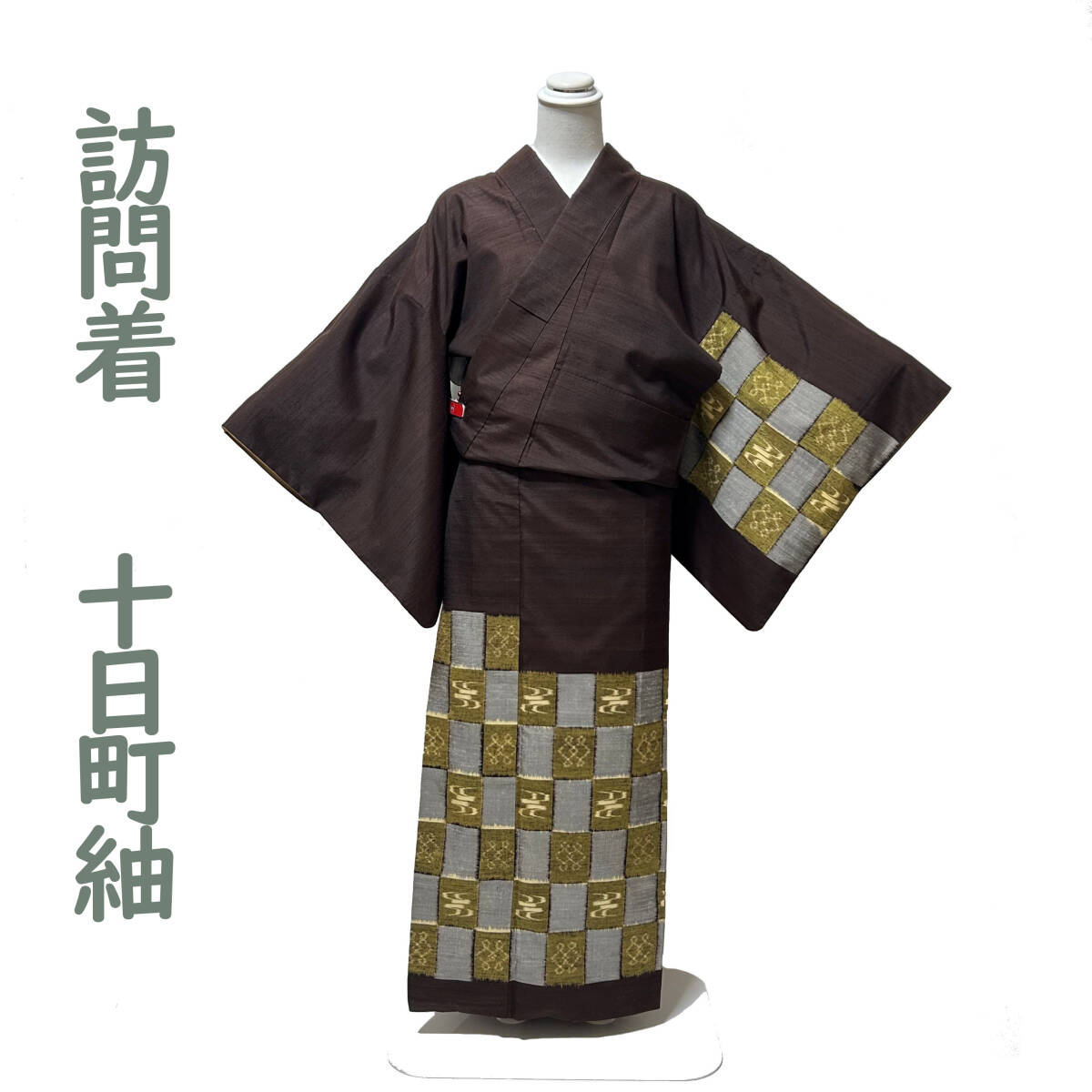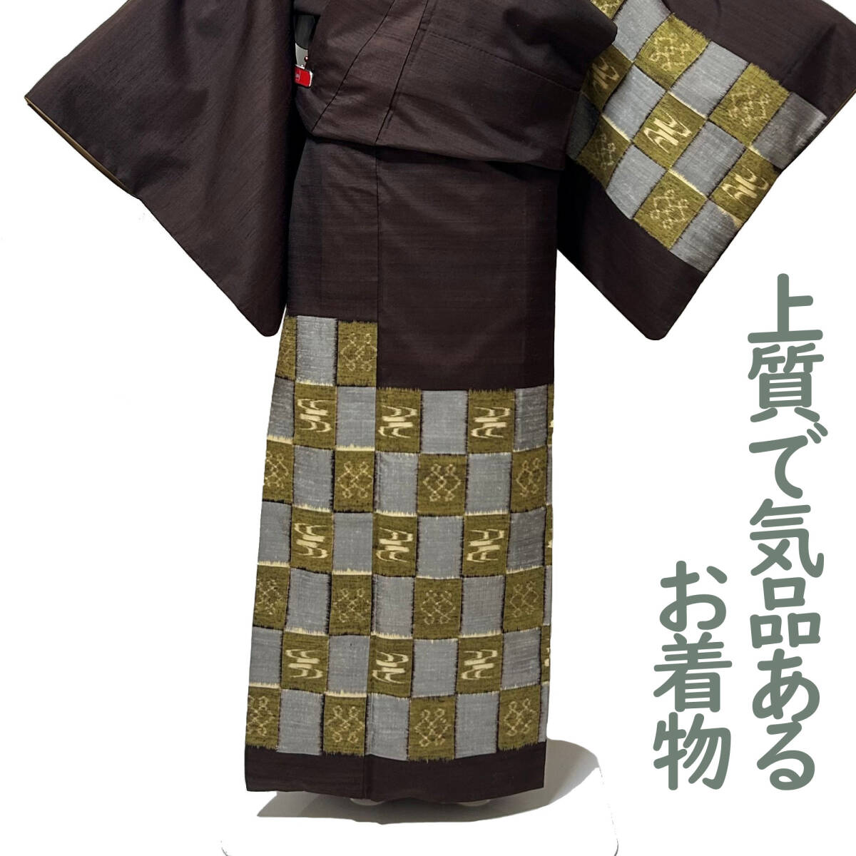 ブラウン地に市松模様がゴールドとグレー2色で織り出され、その中に琉球絣の模様が入った、訪問着として大変価値のある十日市紬のとても良いお品です。どうぞこの機会に是非ご検討下さい!
