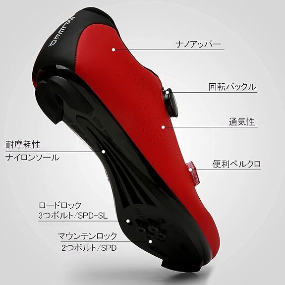 サイクリングシューズ サイクルシューズ ビンディングシューズ 自転車靴 SPD/SPD-SL両対応 快速靴紐 レッド サイズ:28cm