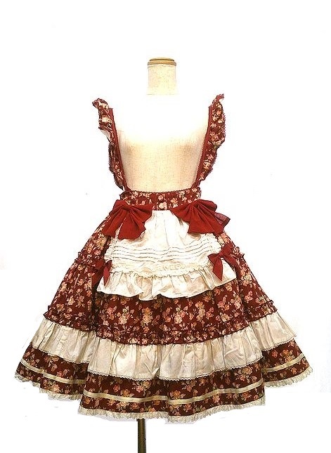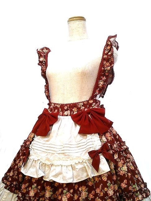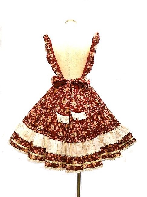 かわいいエプロンの付いたお花柄のフリルたっぷりなスカートです。フリルたっぷりなサスペンダー付き!ボリューム感たっぷりでとってもかわいいのでお探しの方は是非!状態は若干の使用感程度。サイズは66cm〜、着丈57cm。14985(60)20250327