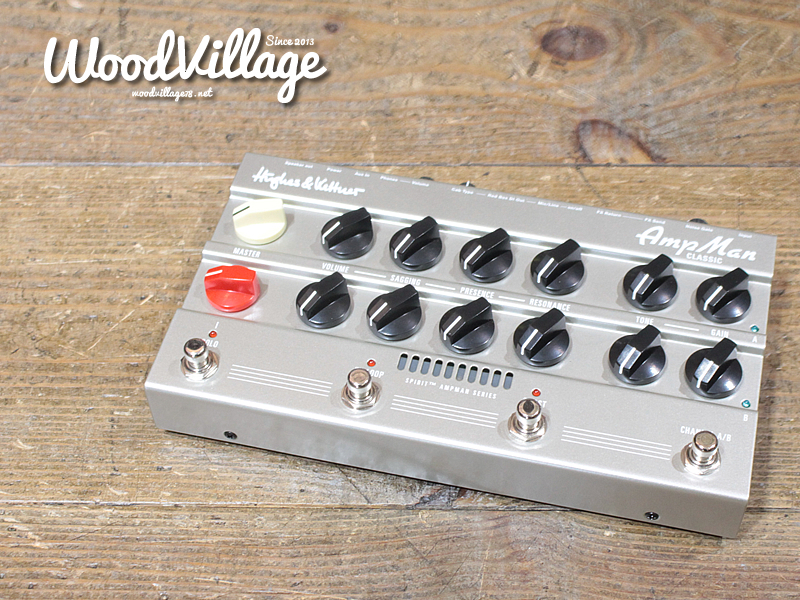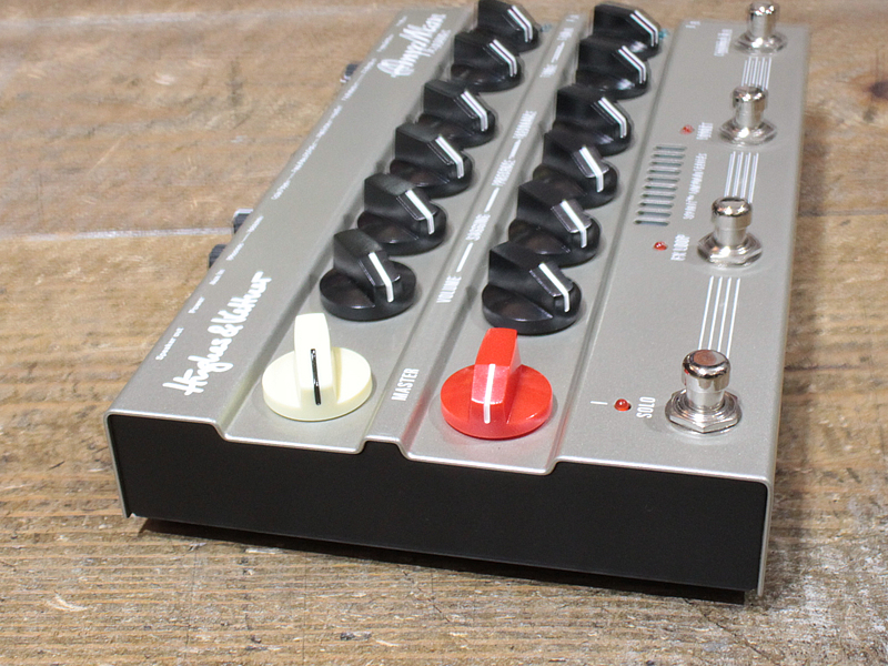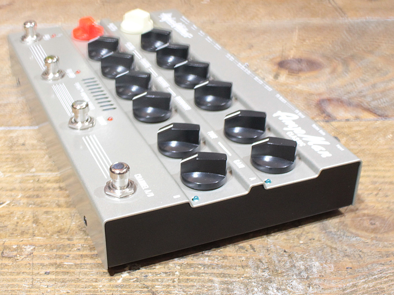 一世を風靡したケトナーのチューブプリアンプTUBEMAN。その意思を受け継ぐペダル型アンプAMPMANです。独立した2チャンネル仕様でエフェクトループ、ノイズゲートも搭載。トレブルなどの通常のEQは無く、TONEとPRESENCE、RESONANCEの3つで帯域を調節します。SAGGINGノブがおもしろく、パワーアンプの負荷具合を調整することができます。上げすぎると潰れた感じになりますが、良い塩梅で調節すると小音量でも、チューブアンプを大音量にセットした際の独特の粘り気ある勢いが感じられるのが心地良い。ブースト量固定のプリブースト(BOOST)と、赤いノブで可変するMASTERと6dBの差をつけられるSOLOがありがたい。