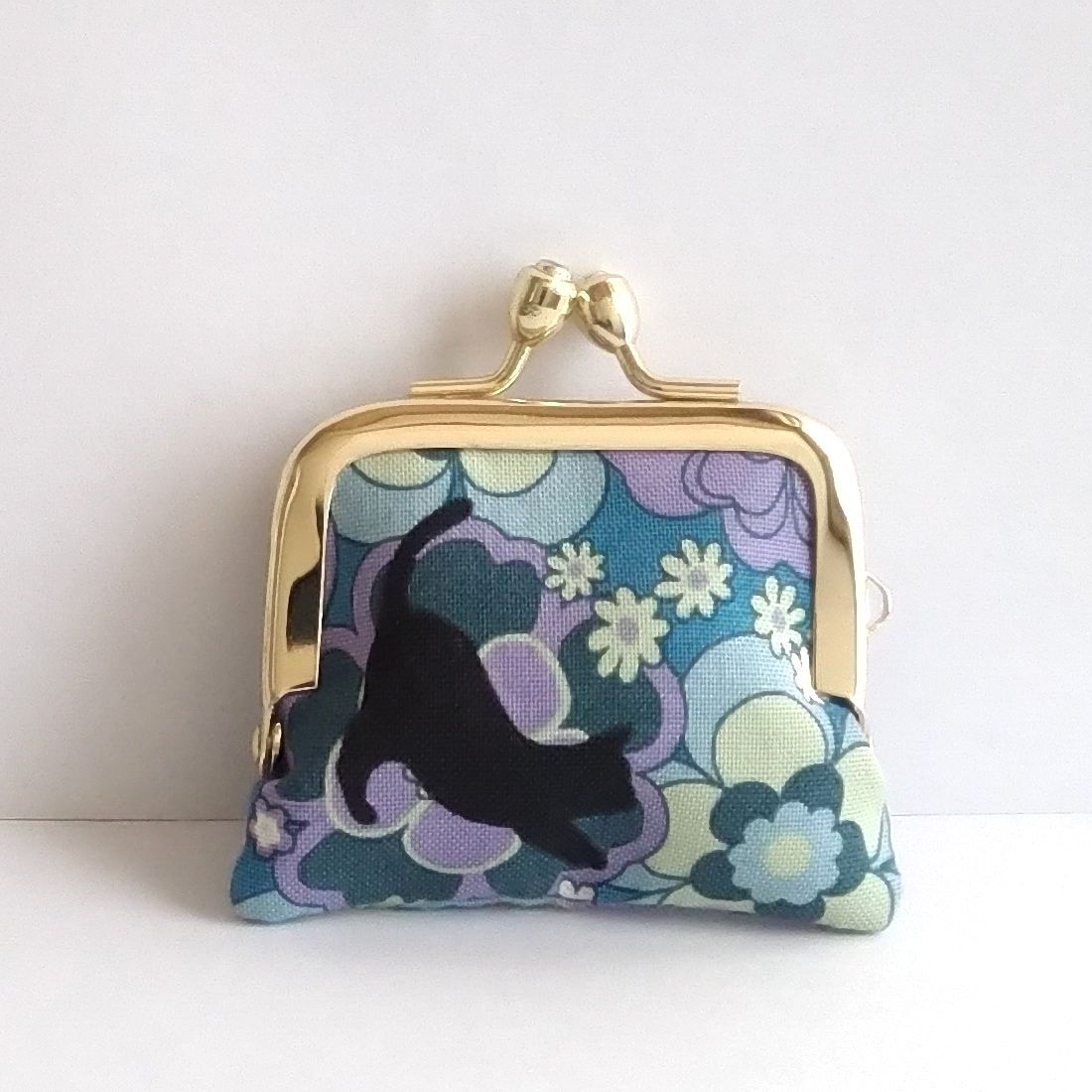 ●櫻●【角がま口】小さいがまぐち♪豆蔵♪396:【送料無料】がま口小物入れ,コインケース,小さい財布,お薬ケース,ネコ,黒猫,花,花畑,レトロ