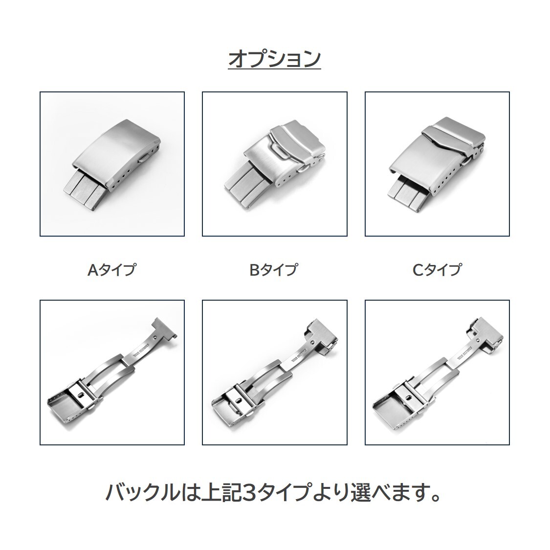 バックルの仕様について、Aタイプ、BタイプとCタイプの3種類(シルバーとブラック2色)があります。