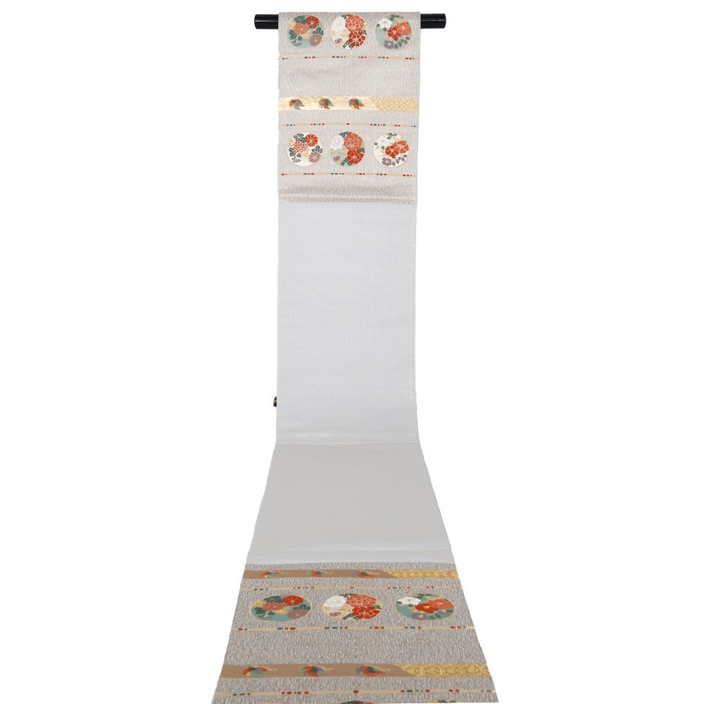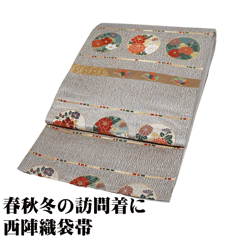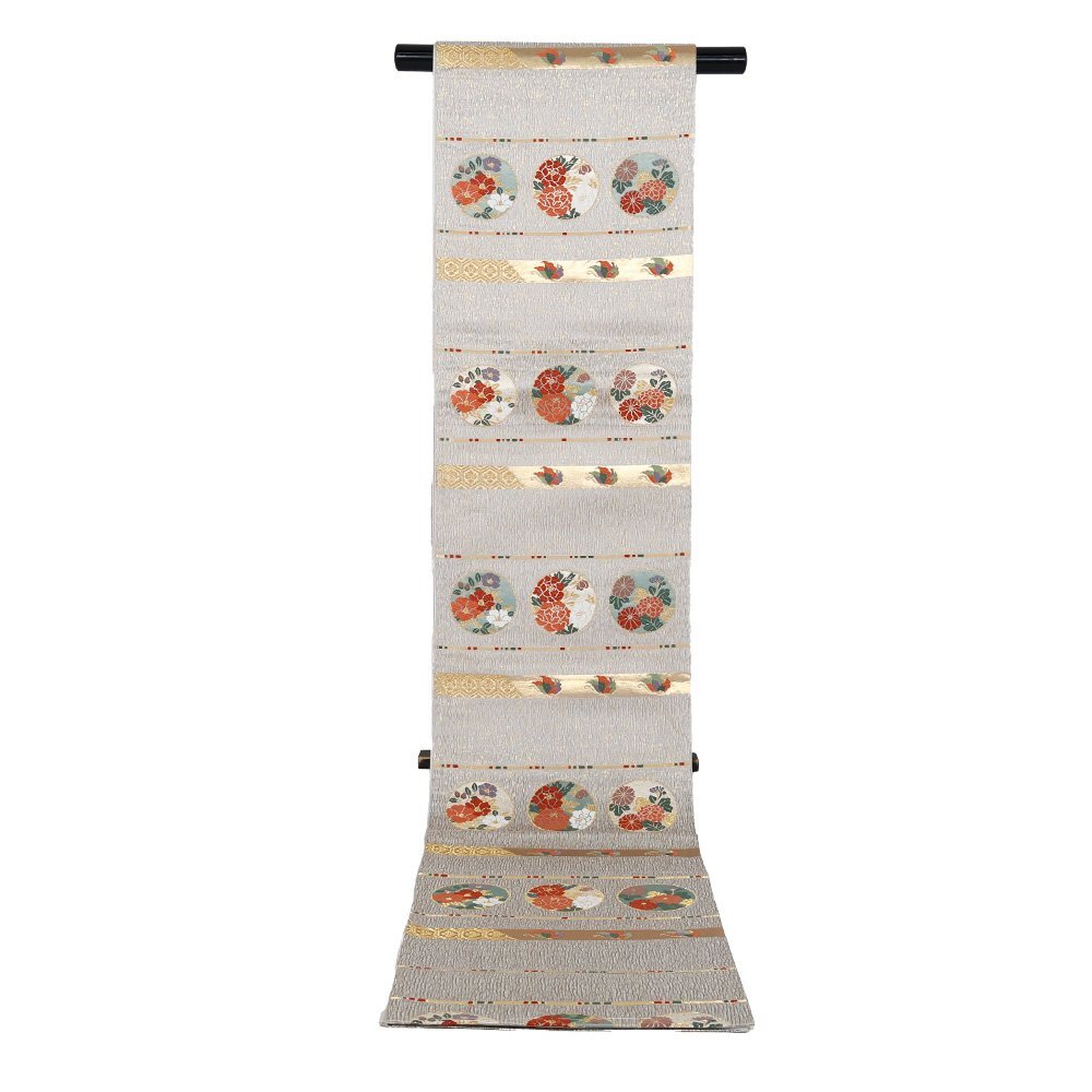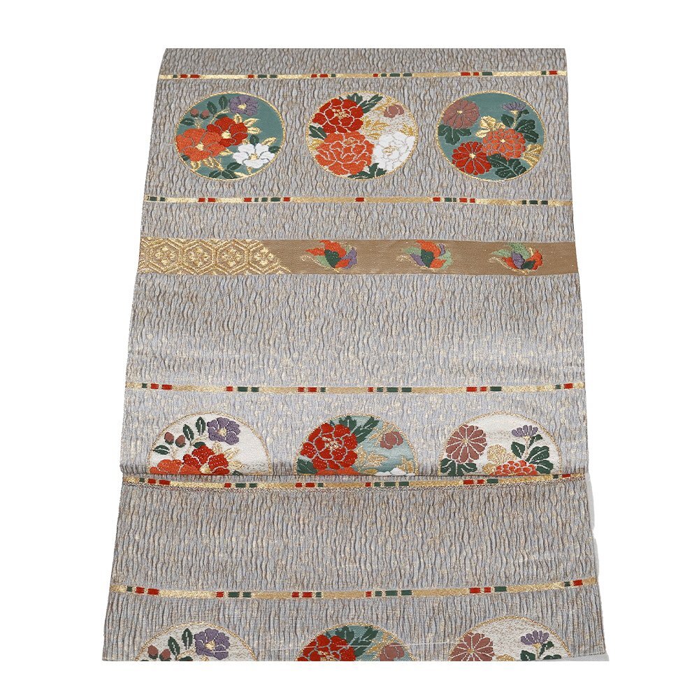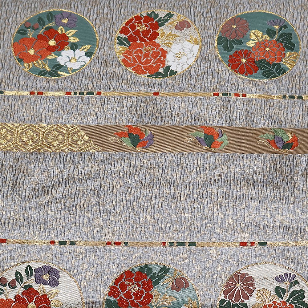 | 西陣織袋帯 緑・グレー・金箔・楊柳地 花丸文 椿・牡丹・菊 仕立て上がり |