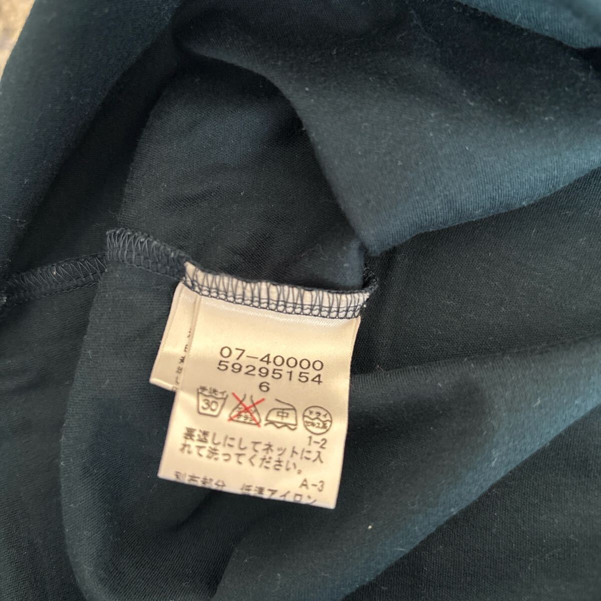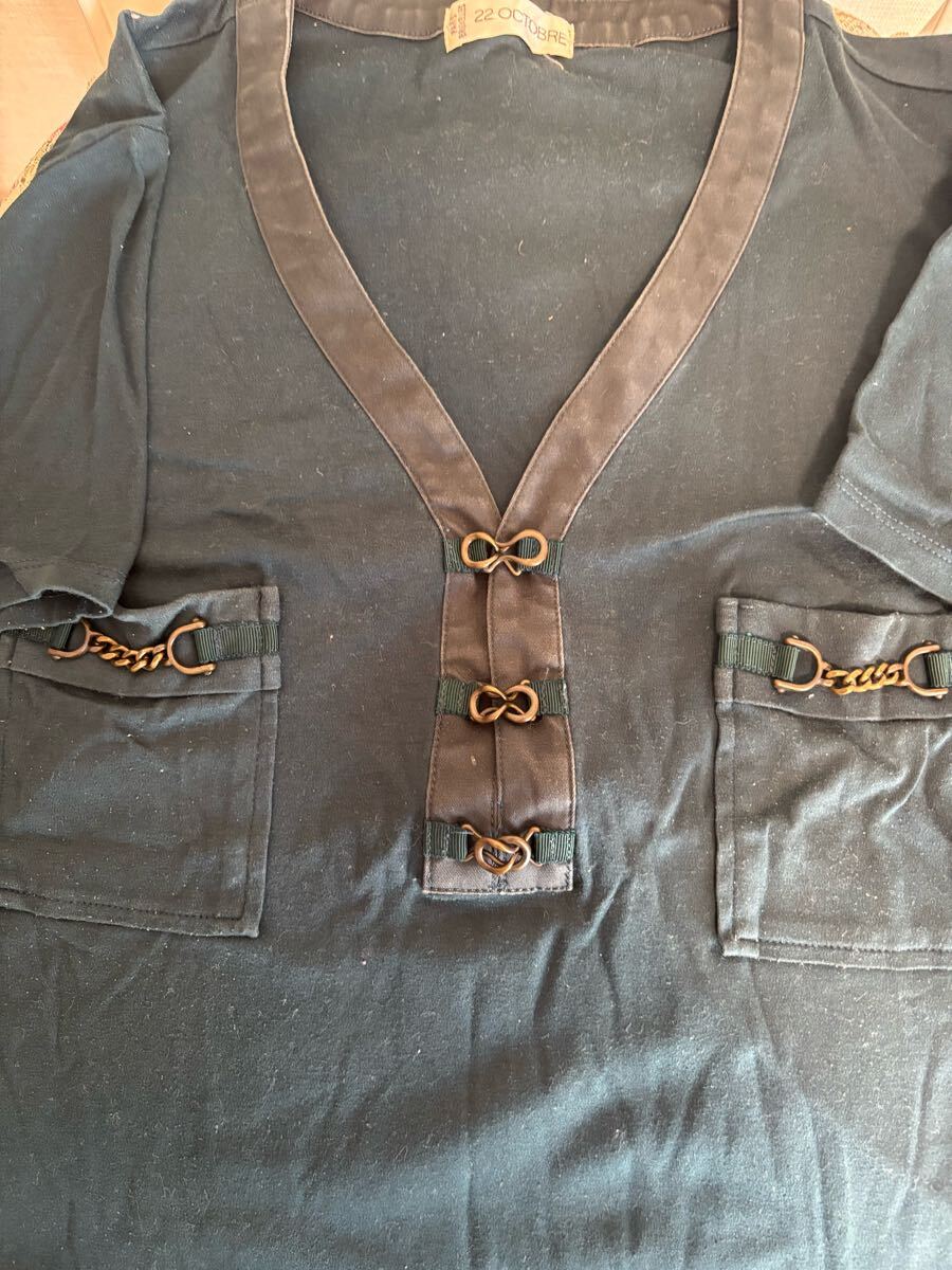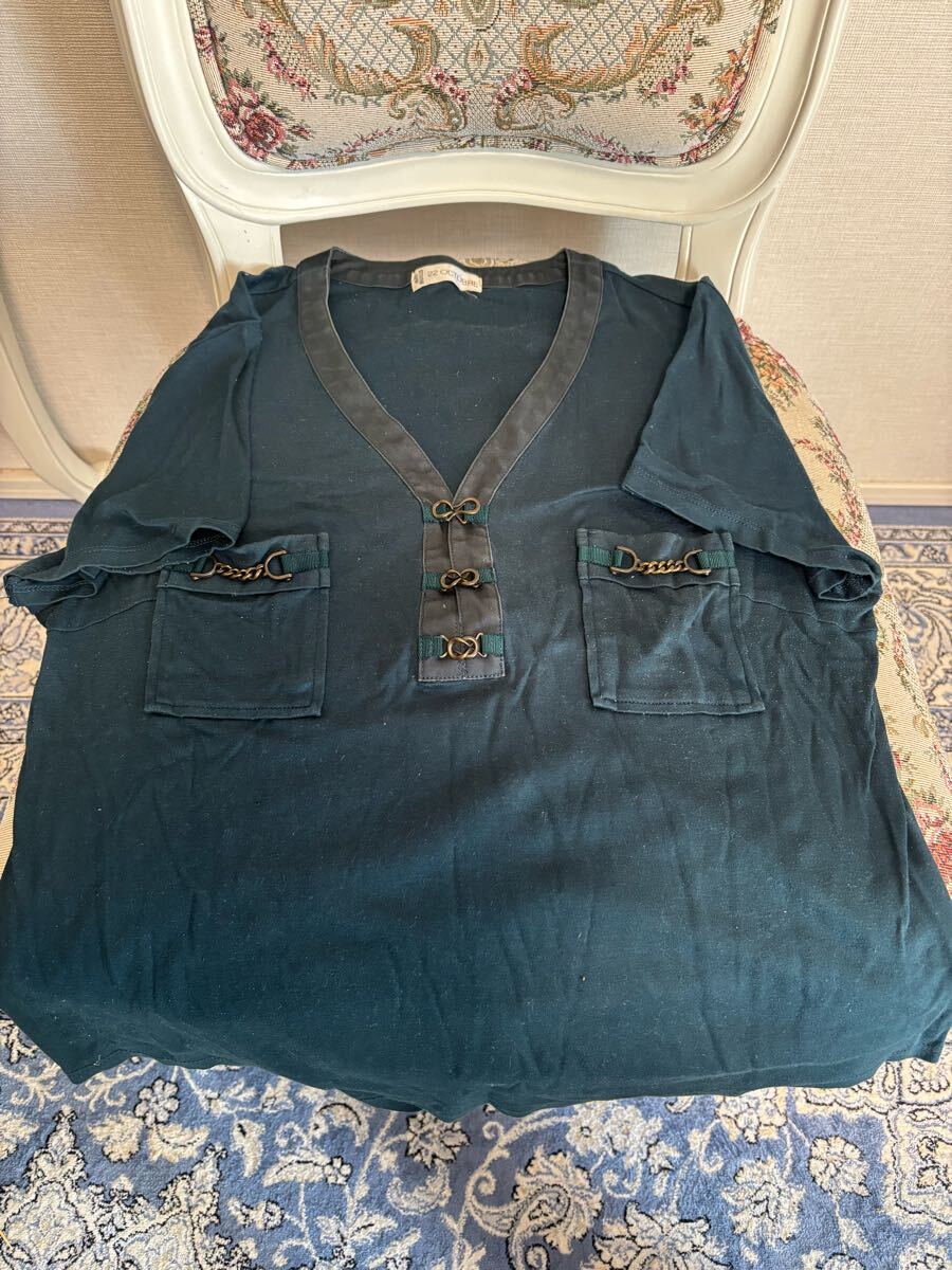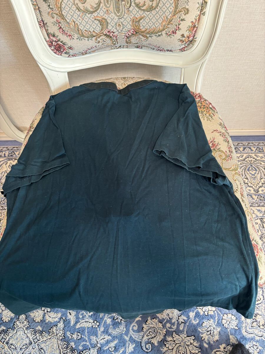 ダークグリーンのVネックTシャツ、ポケット付きで金属製の留め具が特徴。