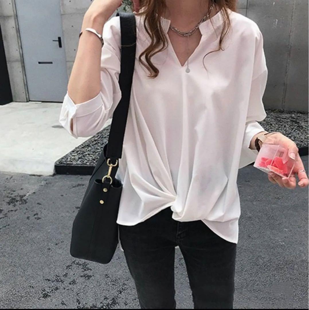 ・襟のVカットもお顔周りを華奢に魅せるデザインになっているので、オンオフ問わず着まわしたい一着