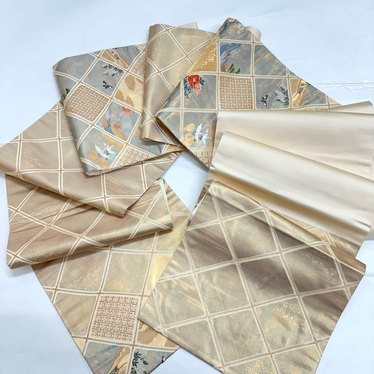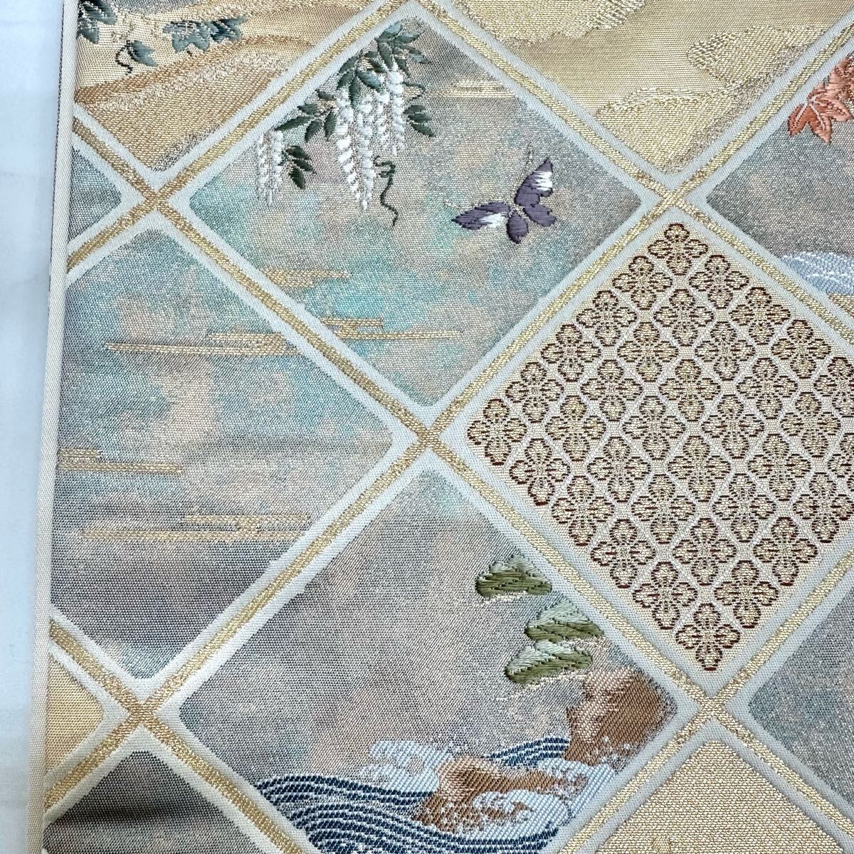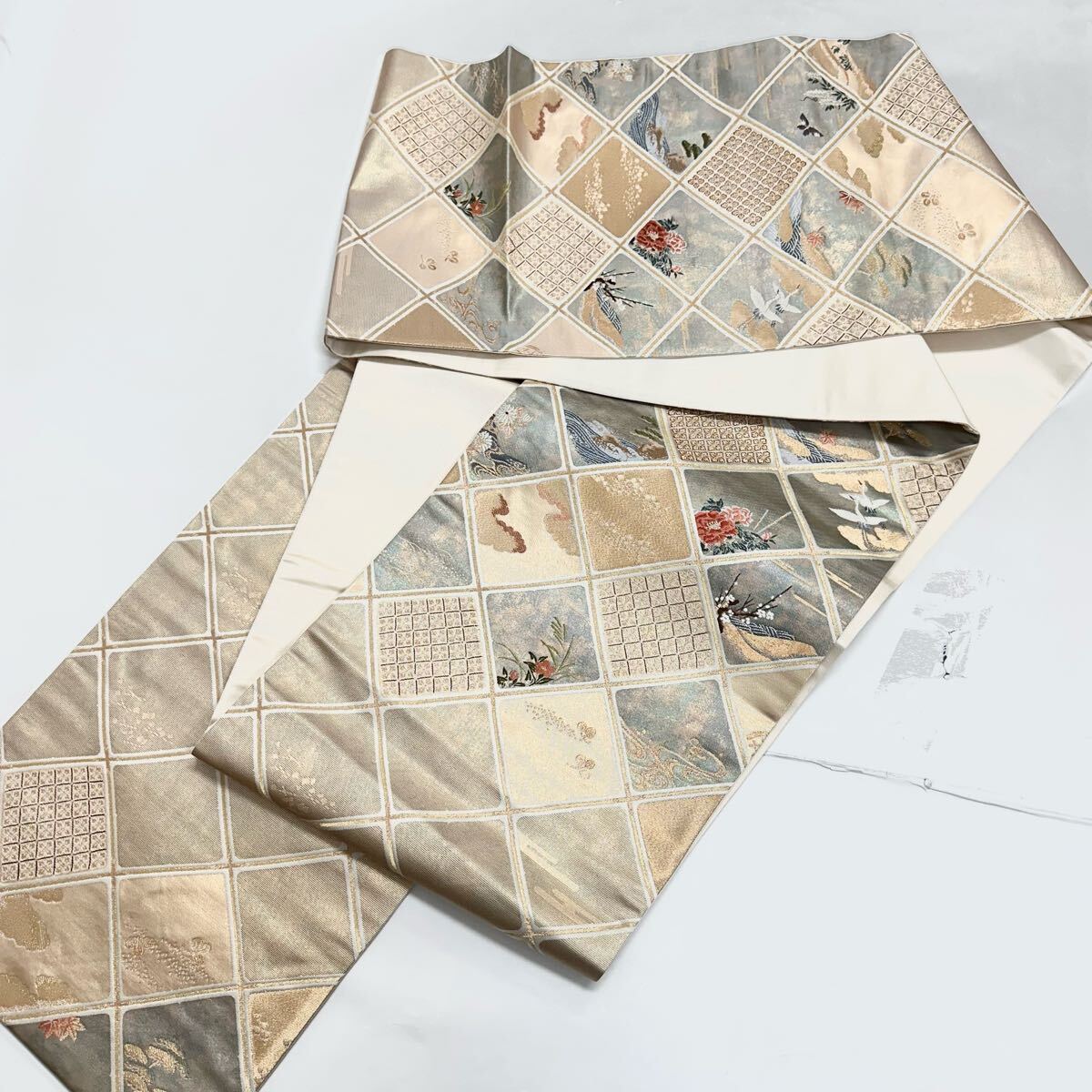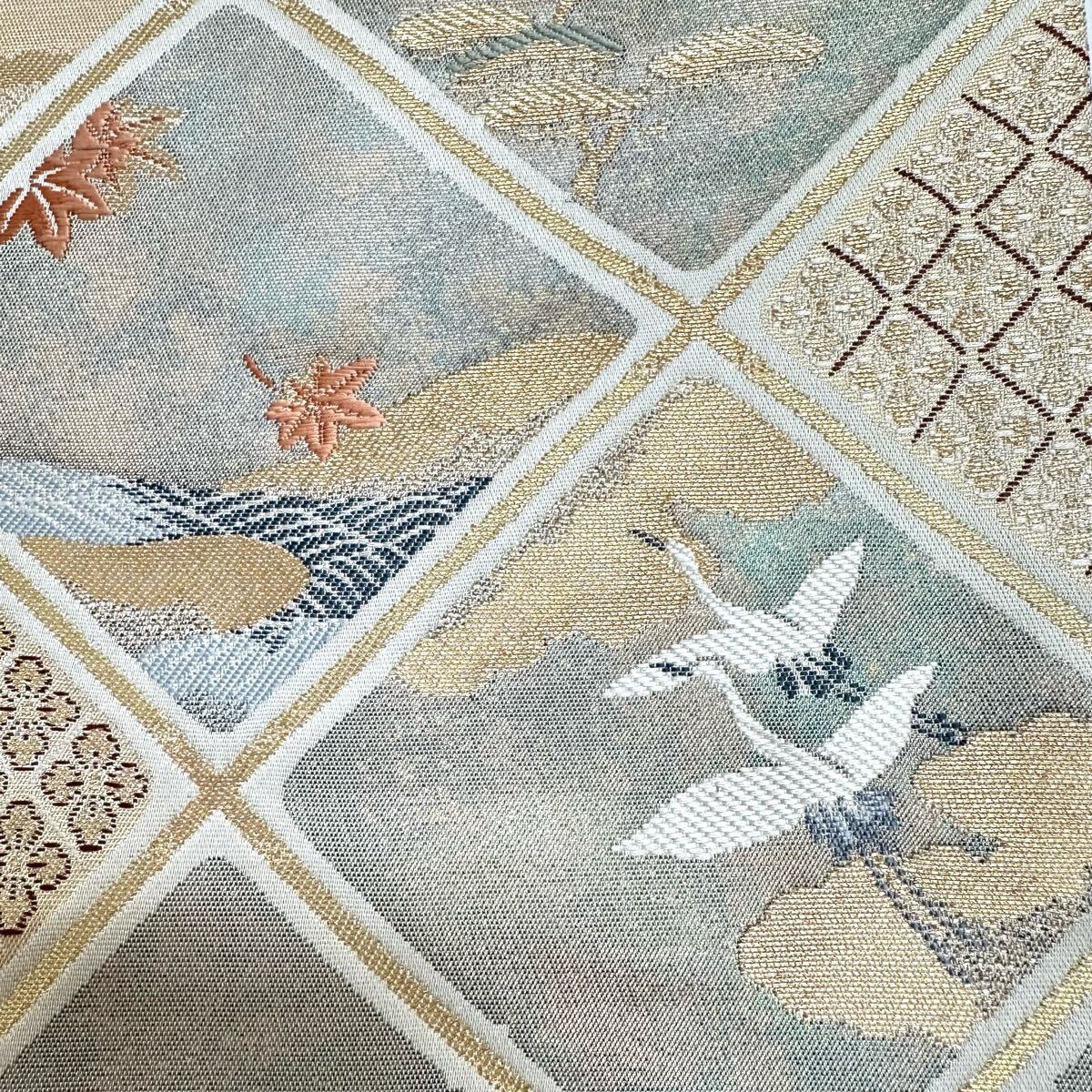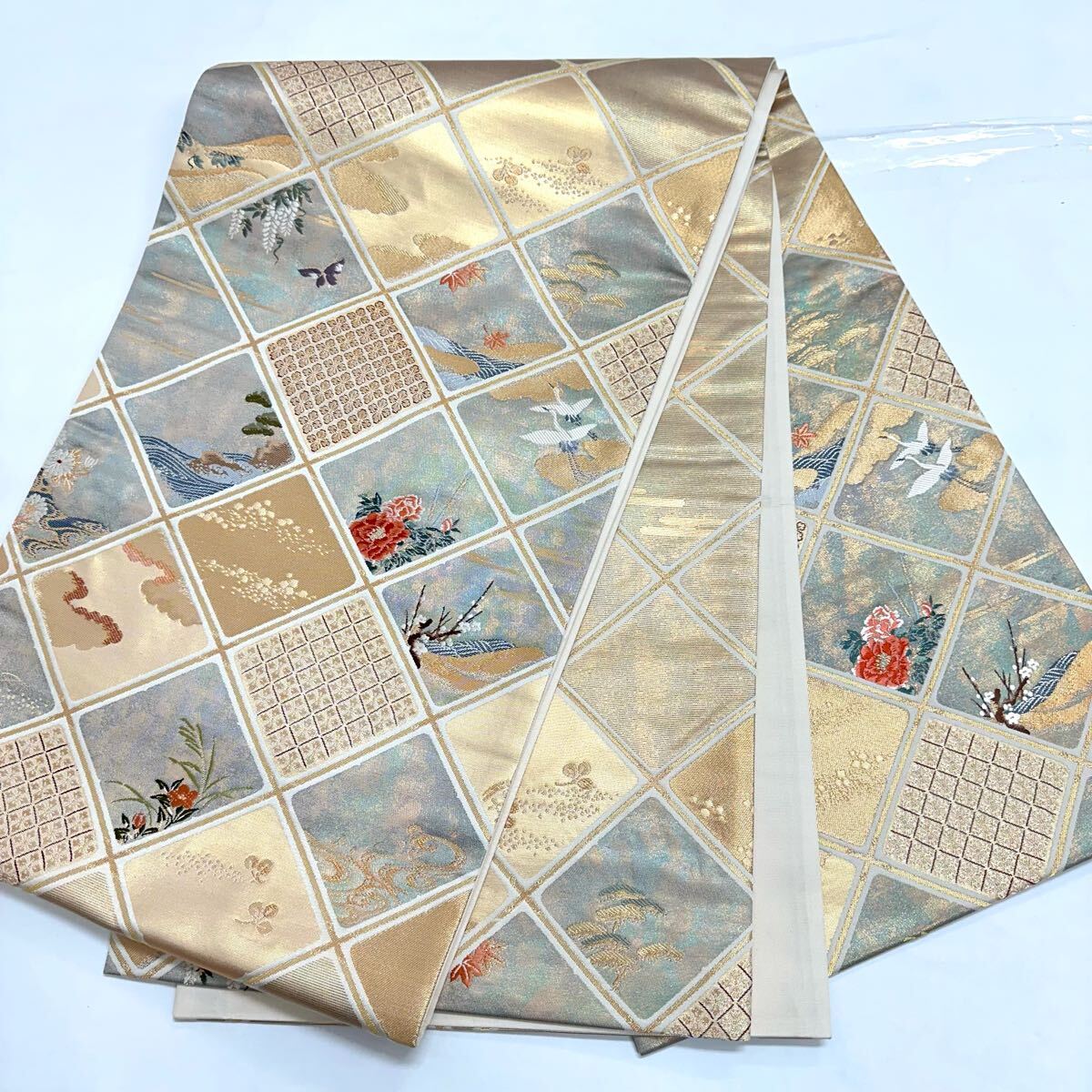 【七福】c470 逸品 高級品 正絹 袋帯 太鼓柄鶴 四季花 蝶 金糸 刺繍 豪華