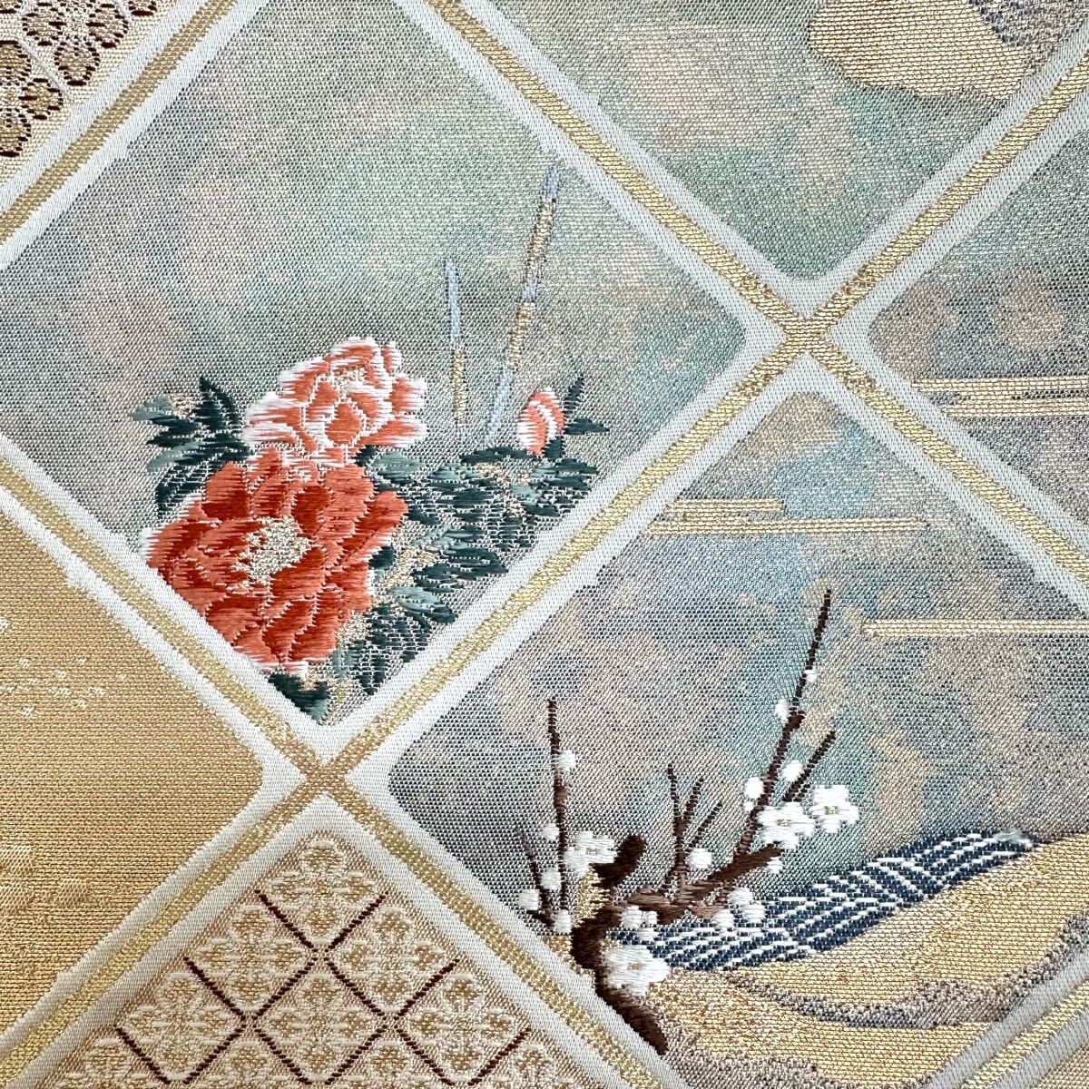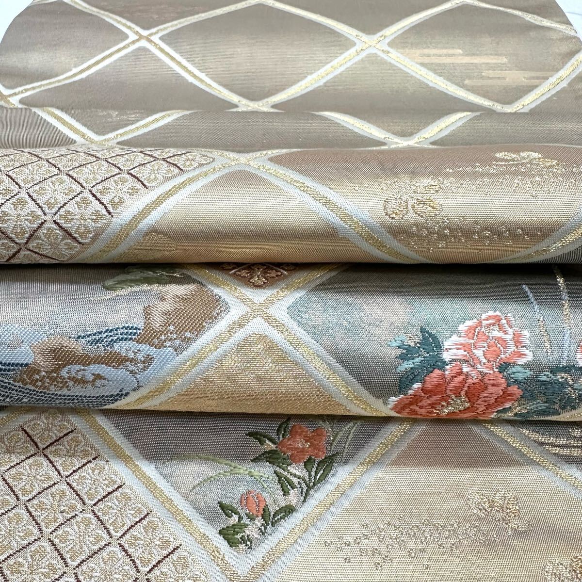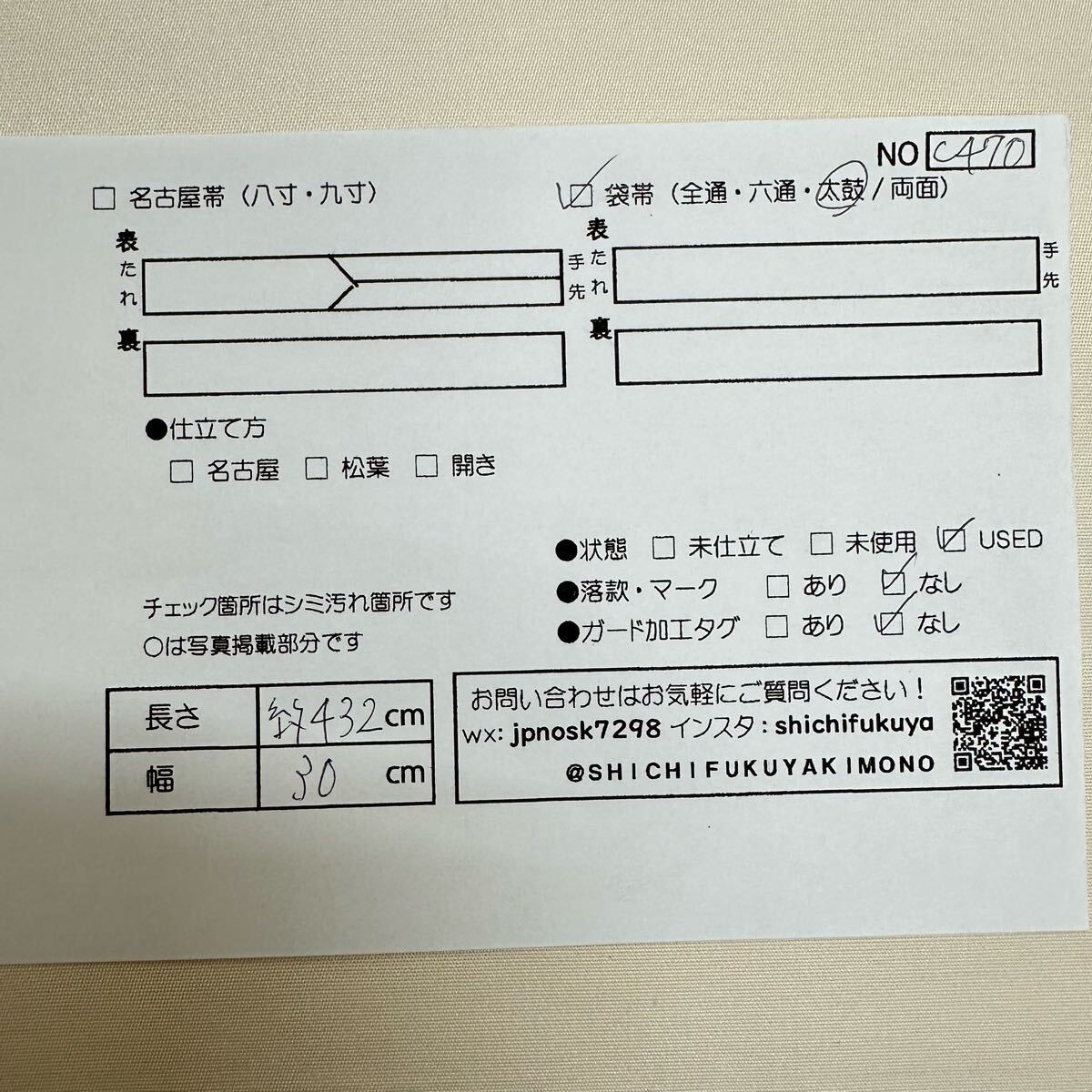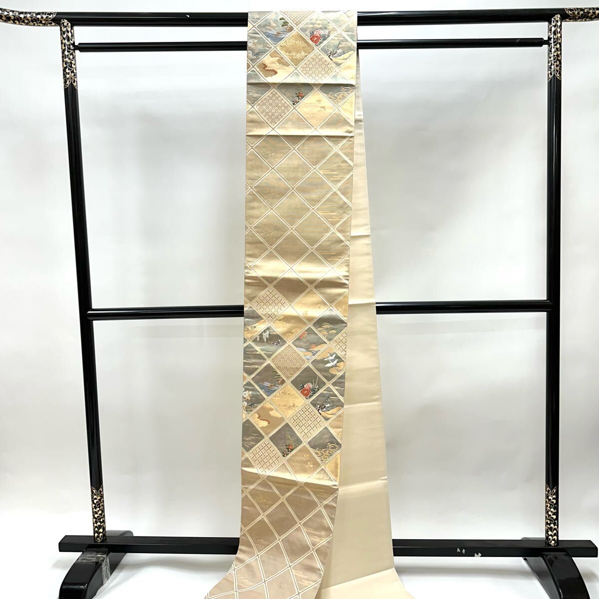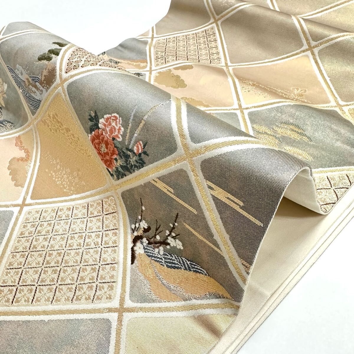 【七福】c470 逸品 高級品 正絹 袋帯 太鼓柄鶴 四季花 蝶 金糸 刺繍 豪華