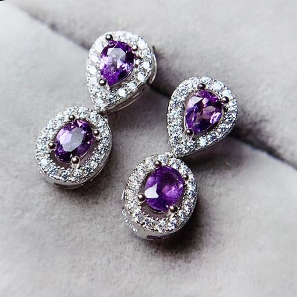 925 シルバー天然アメジストドロップピアス、4 個天然アメジスト空中ブランコ乗りためのファッションピアス