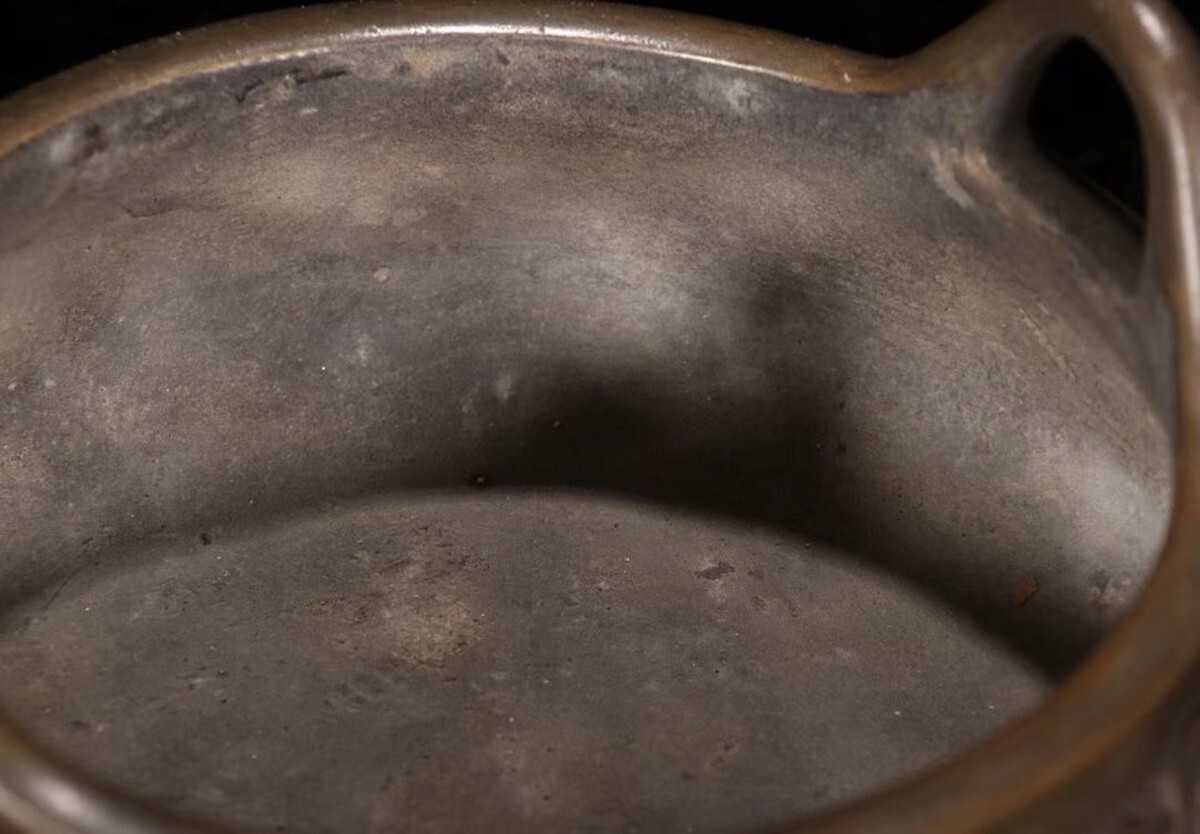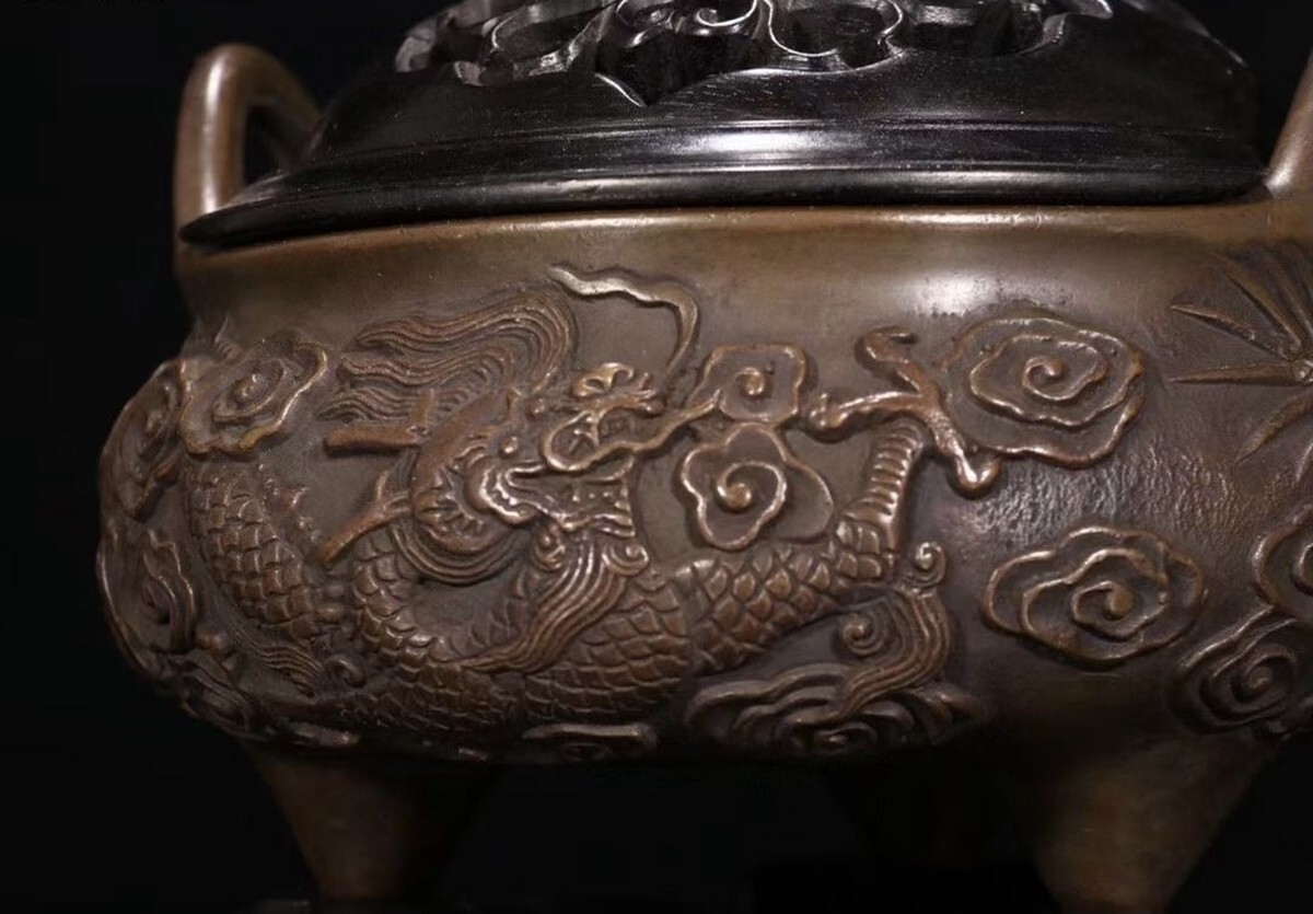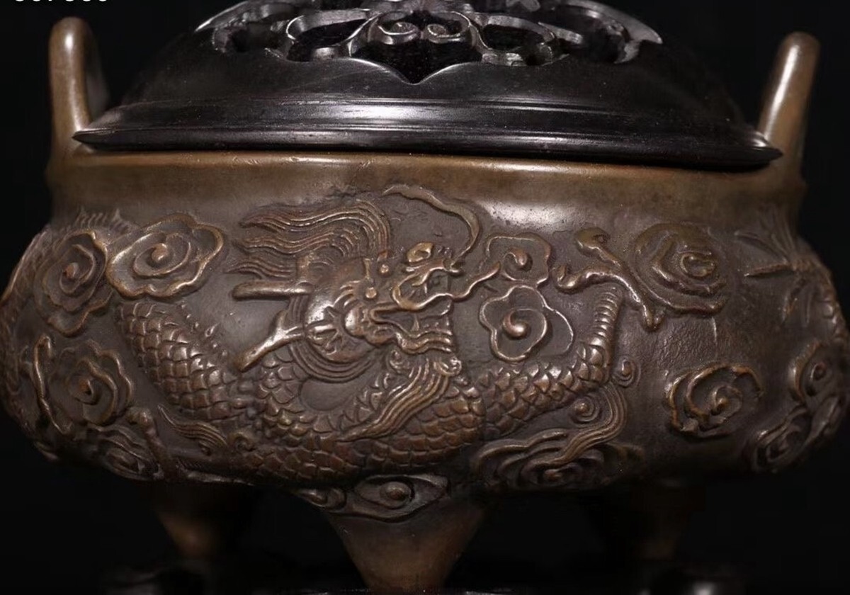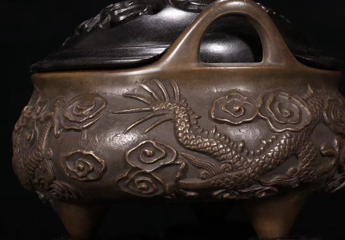 「明代 大明宣徳年製 古銅彫 祥龍紋双耳三足老銅香薰炉」銅製 置物 銅器 擺件 賞物 古美術 骨董品 蔵出