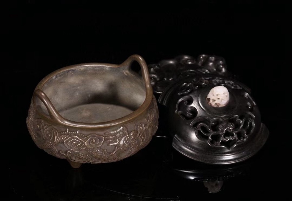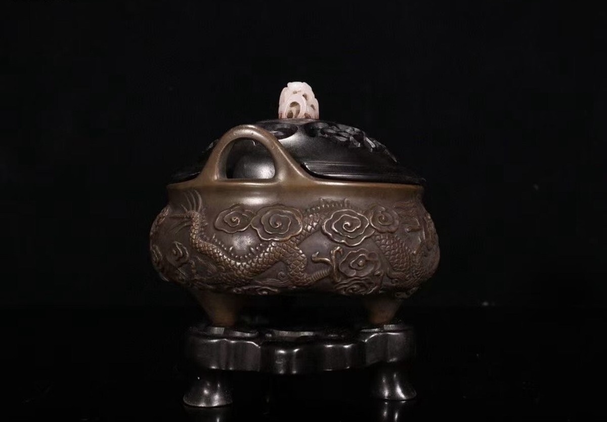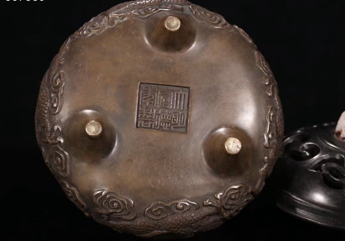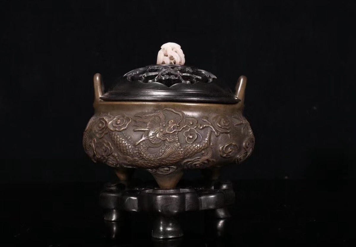 「明代 大明宣徳年製 古銅彫 祥龍紋双耳三足老銅香薰炉」銅製 置物 銅器 擺件 賞物 古美術 骨董品 蔵出