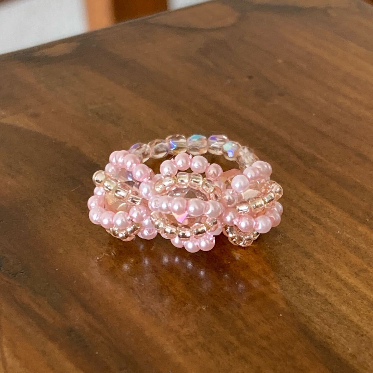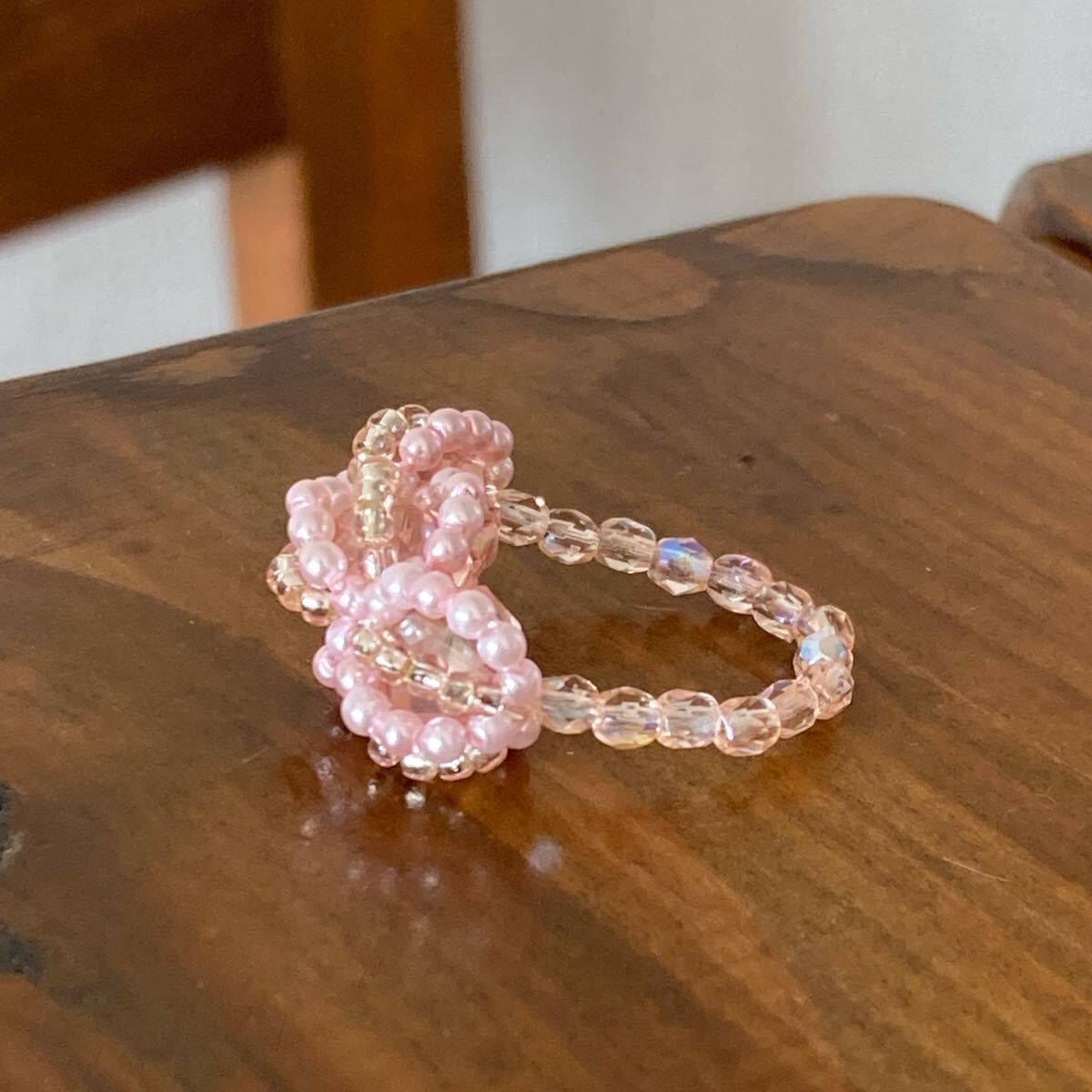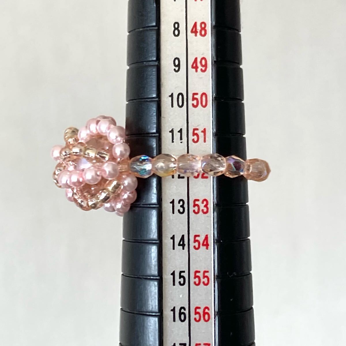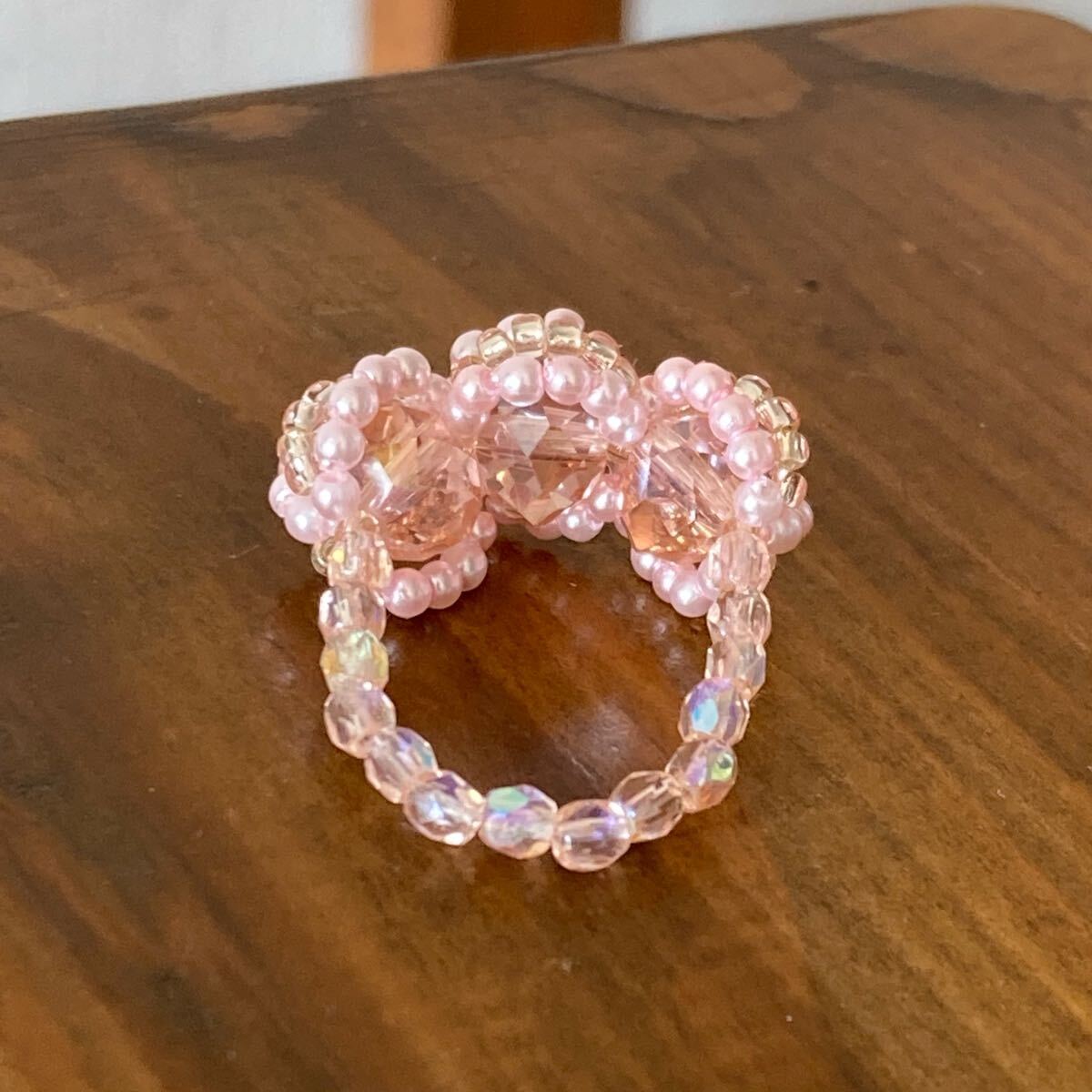 8mmのクリアピンクのボタンカットビーズ、ピンクのミニパールビーズ、3mmのクリアピンクのチェコビーズ、クリアピンクの丸小ビーズで作ったリングです。
