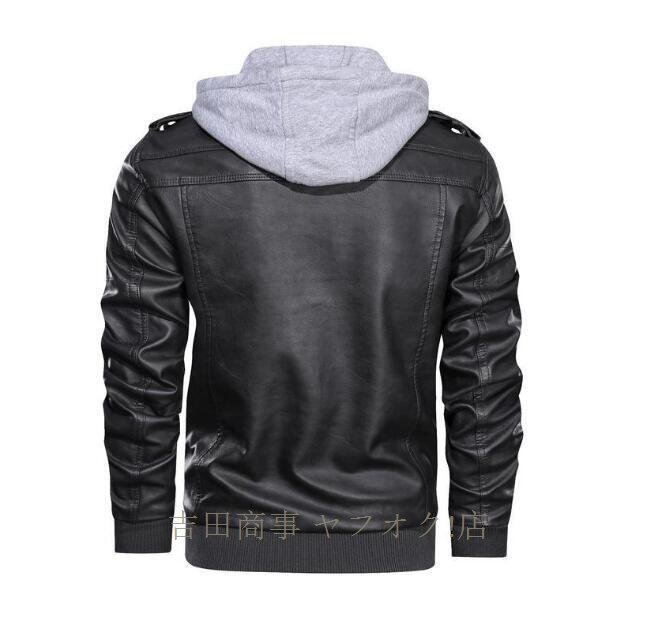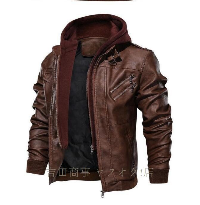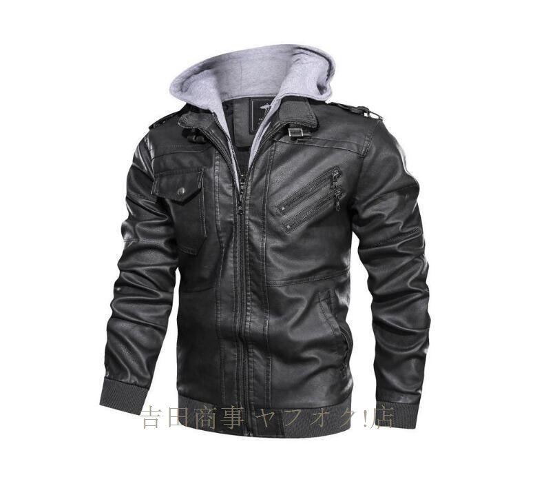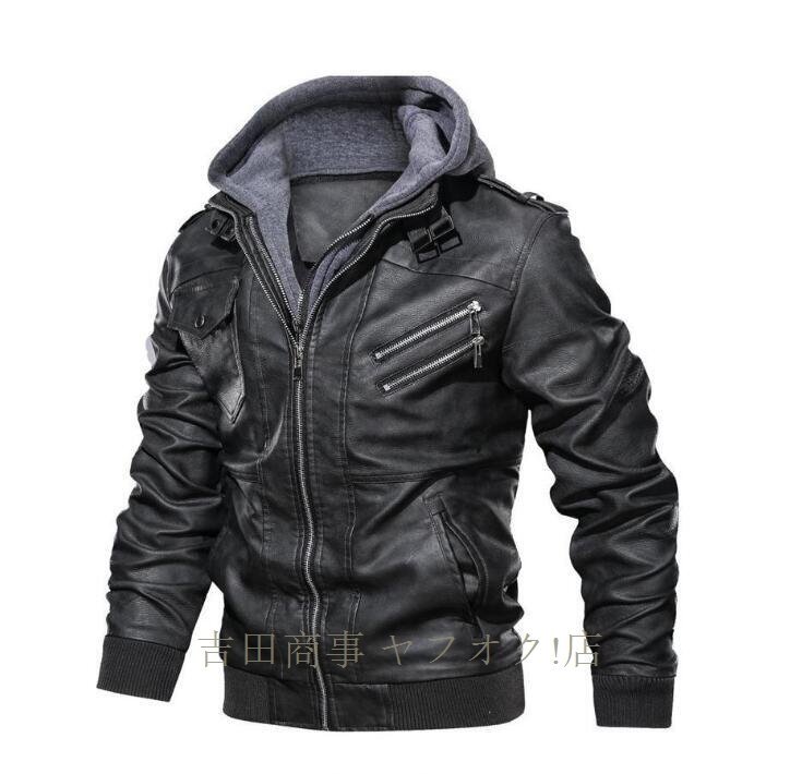 ☆新品ライダースジャケット メンズ 革ジャン レザー バイクジャケット ブルゾン アウター フード付き 防風 秋冬 黒 お色選択可