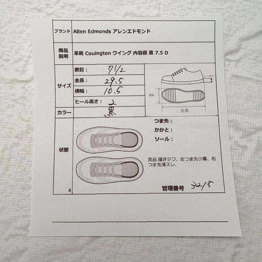 ブランド Allen Edmonds アレンエドモンズ ◆商品説明 【COVINGTON】 仕様:ウイング サドル 内羽根 5アイレット レザーソール グッドイヤー製法 トゥスチール 着用:ビジネス ドレス フォーマル カジュアル ◆サイズ / 7.5 D / 7 1/2 / 25.5 アウトソール全長:29.5 アウトソール横幅:10.5 ヒール高さ:2 ◆カラー 黒 ブラック ◆付属品 ◆コンディション 写真でも確認お願いします。 つま先→左つま先小傷・右つま先薄擦れ・履きジワ かかと→ ソール→少し減り 靴全体→少し使用感ありますが まだまだご愛用いただける商品です。 ◆購入元 ブランドリユース店 日本流通自主管理協会加盟店(AACD) 質屋・古物市場・ストア商品 W3215.110