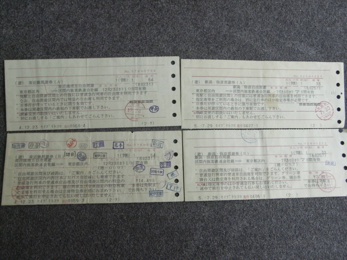 4枚/マルス周遊券 南近畿周遊券(A)(B)・新潟弥彦周遊券(A)(B) 平成4年・5年 西武鉄道所沢発行