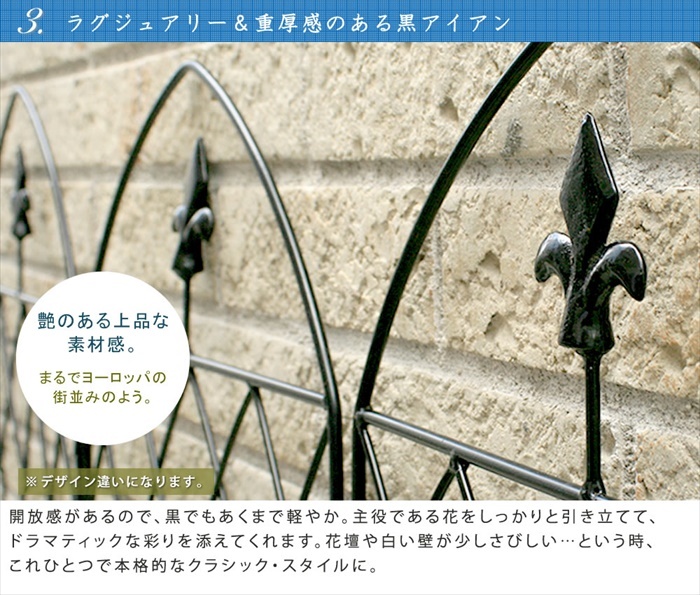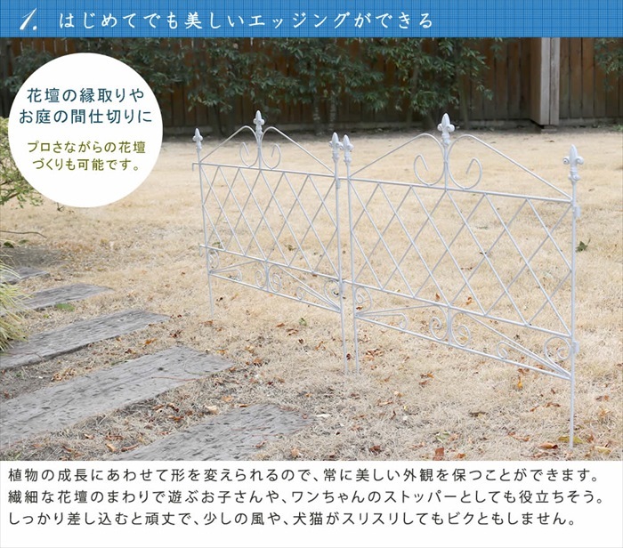 直線と曲線のバランスが上品キレイ♪ いつものお庭が見違える! どんなお庭にも似合う、シンプルな中にエレガンスが薫るアイアンフェンス。 直角のエッジを作ったり、四方を囲って正方形の花壇を作ることもできます。 ラフな庭園も美しいですが、整然とした清潔感のある庭園はお手入れがしやすく、植物それぞれの個性をしっかり感じ取れる良さがあります。 設置は地面に差し込むだけ。これ以上ないほどカンタンです! 美しい漆黒のアイアンフェンスが、気品ある花壇づくりのお手伝いをします。 |