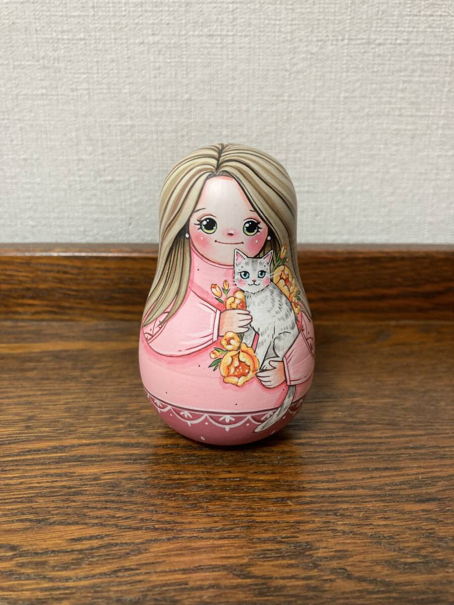 アメリカ、ヨーロッパなど世界各国で人気の高いロシア人アーティスト、マルガリータ・モイセーワさんのの起き上がりこぼし『Cute Cat With Peony Flower』です。