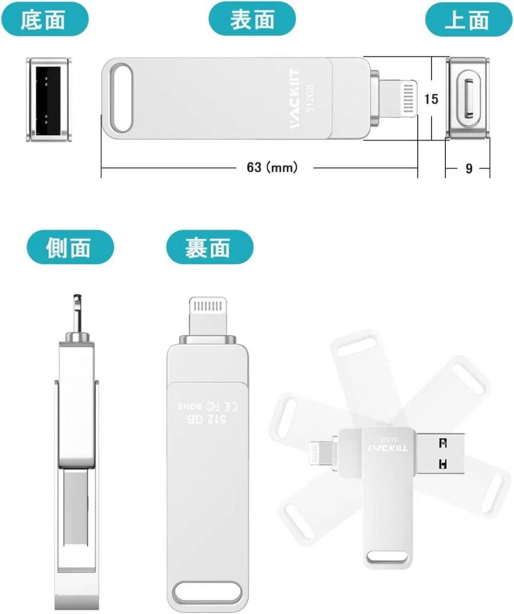 Vackiit「Apple MFi認証取得」512GB iPhone用 usbメモリusb iphone対応 Lightning Type-C USB iPhone用 メモリー iPad用 iphone から