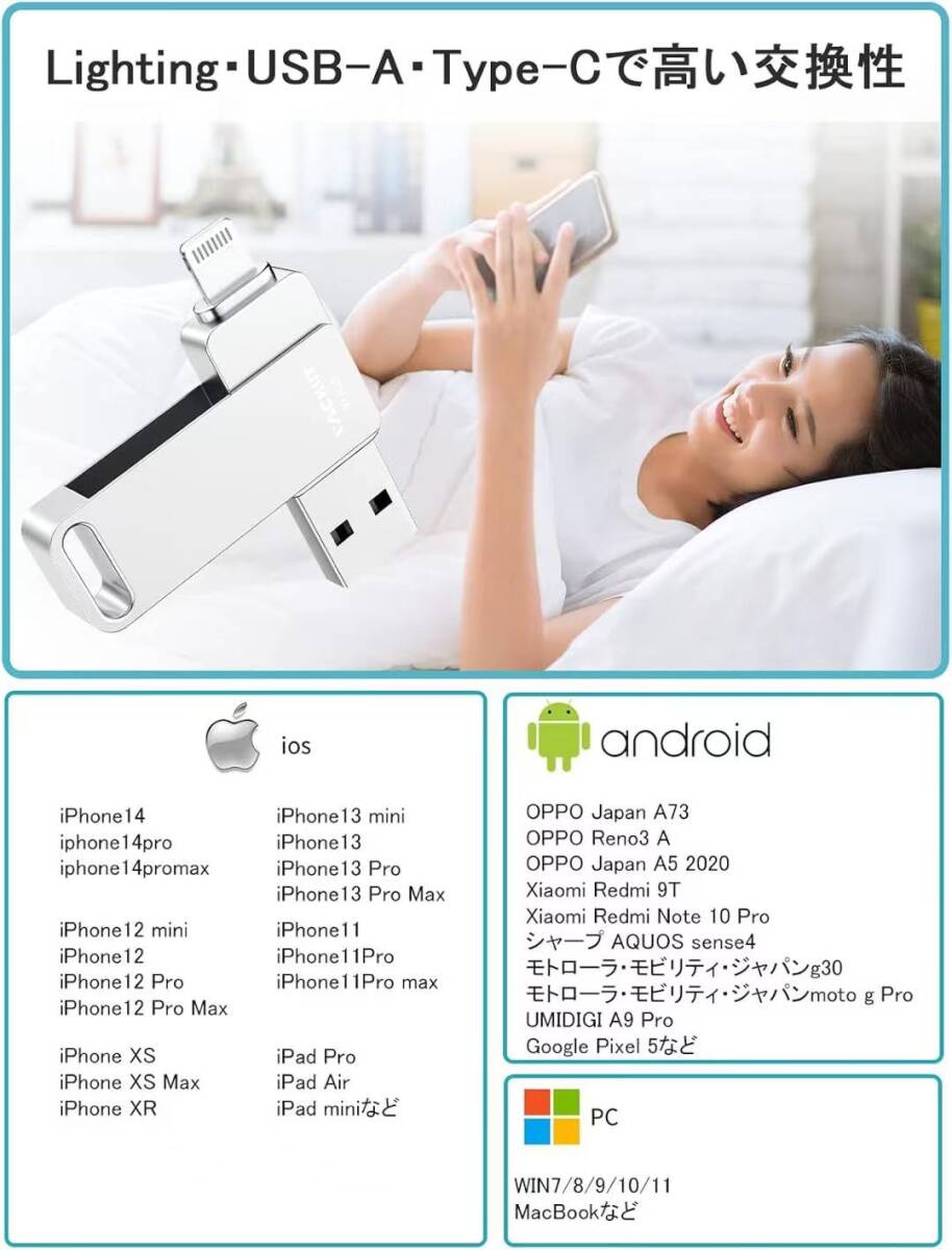 「大容量usbメモリ・幅広い交換性アイフォンusbメモリ 」512GB のiPhone USBメモリでストレージを拡張でき、iOS デバイスを容量不足から徹底的解放させます!更に、すべてのiPhoneおよびiPadシリーズと互換性があります。iPhone14/14 pro /14 Pro MaxiPhone 13 /13 Pro/13 Pro Max/13 mini/iPhone 12 /12 Pro/12 Pro Max/12 mini/ 11 /11 Pro/11 Pro Max / SE (第2/1世代) /X /XS/XS Max /XR/8 Plus/8 / 7 Plus/7 /6s Plus/6s/6 6 Plus /Pad Pro / iPod touch 6/ MacBook Air/Macbook Pro/ iMac/PC /ノートパソコンなどのデバイスに対応します。