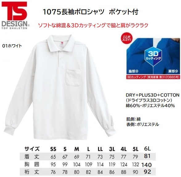 [ネコポス発送/1枚]★TSDESIGN 1075長袖ポロシャツ ポケット付き【01ホワイト・Mサイズ】定価3000程度の品、即決880円!!