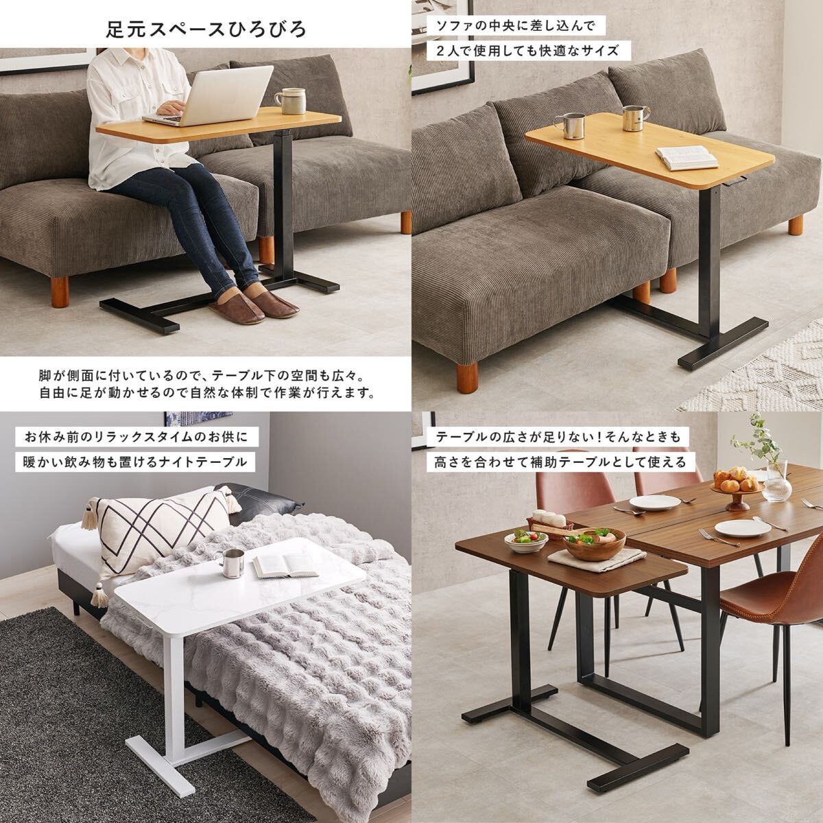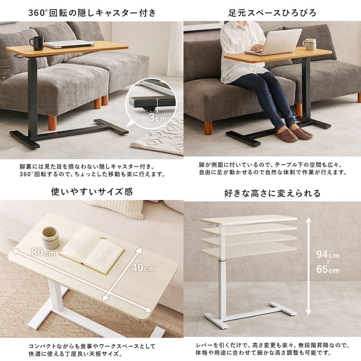 キャスター付きで移動がしやすく、ソファやベッドに座って作業するときも脚が邪魔にならないデザインです