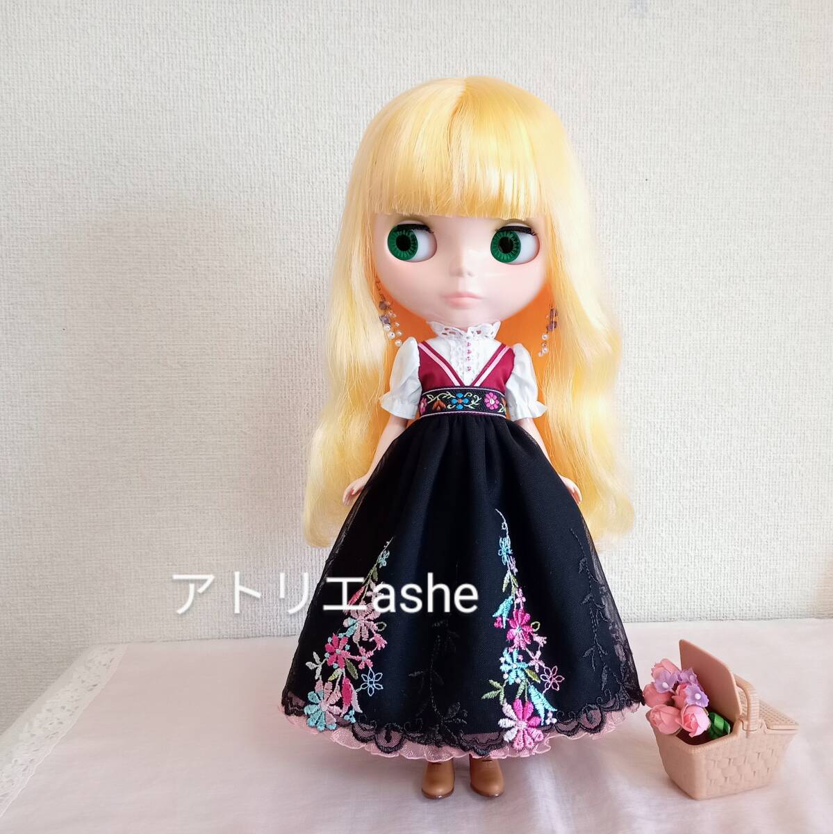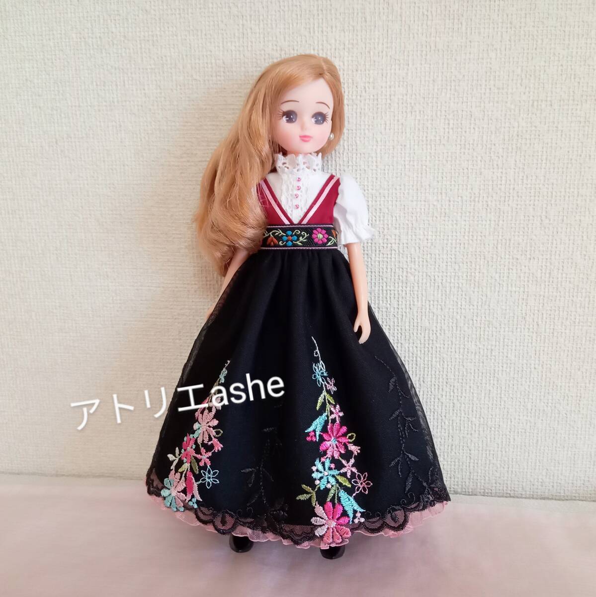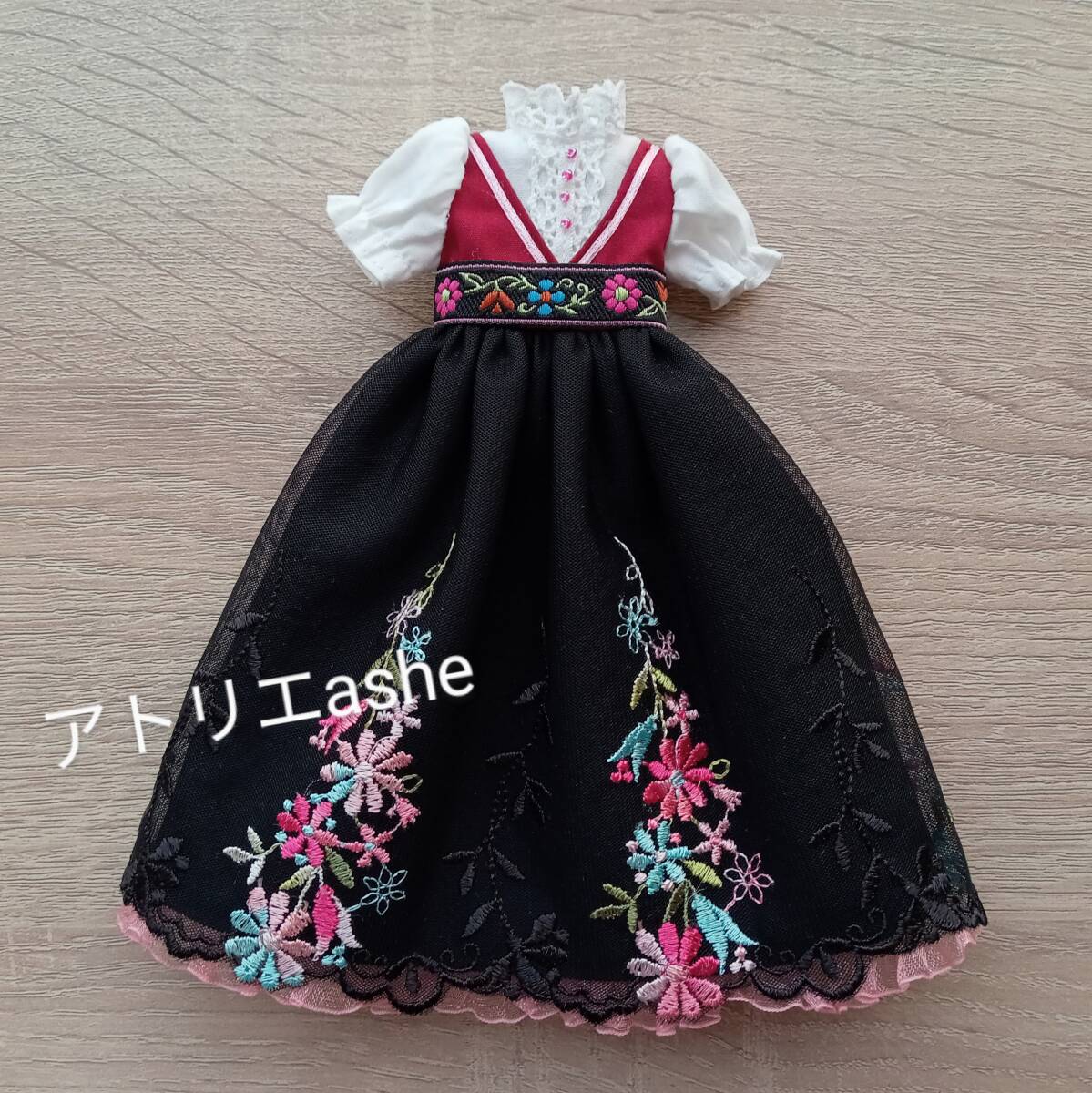 送料無料! ハンドメイド ネオブライス・リカちゃんの服 「民族衣装風 チュールレースドレス 黒」ブライス 服 ワンピース アウトフィット