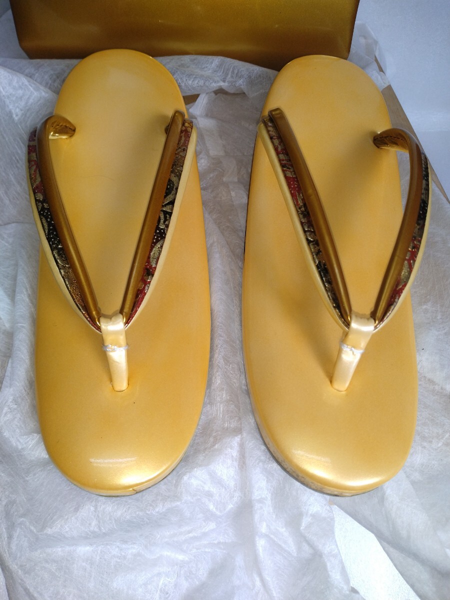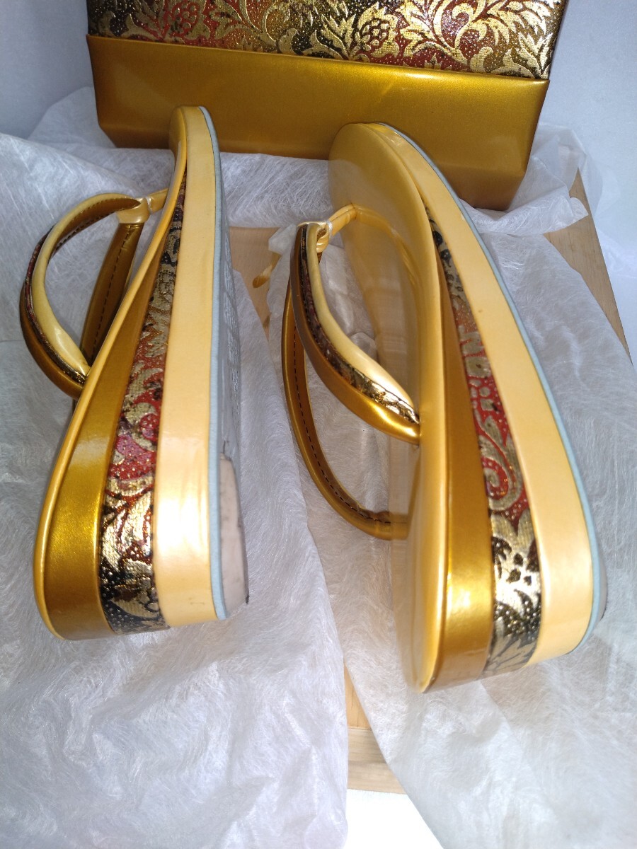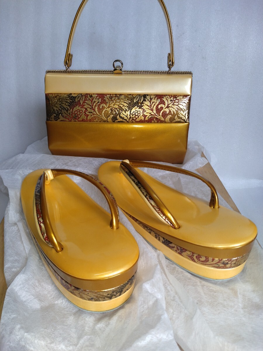 K987【中古良品】 着物 和装 草履 和装バッグ セット ゴールド 本革製品 木箱 | ||