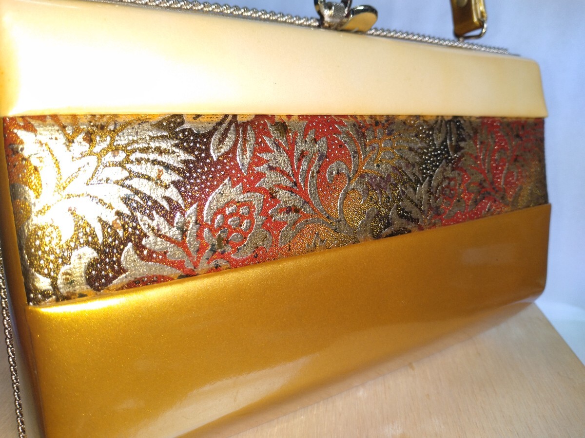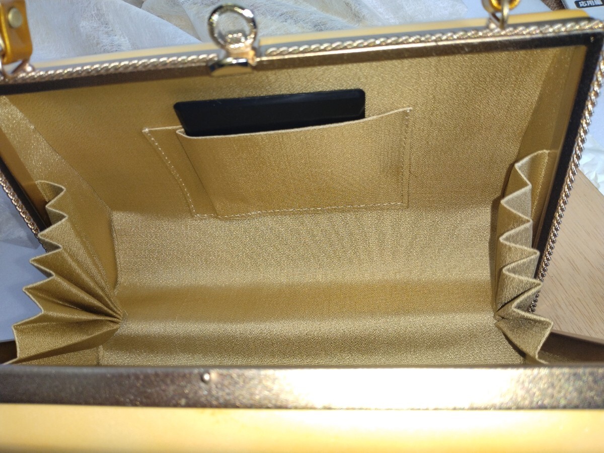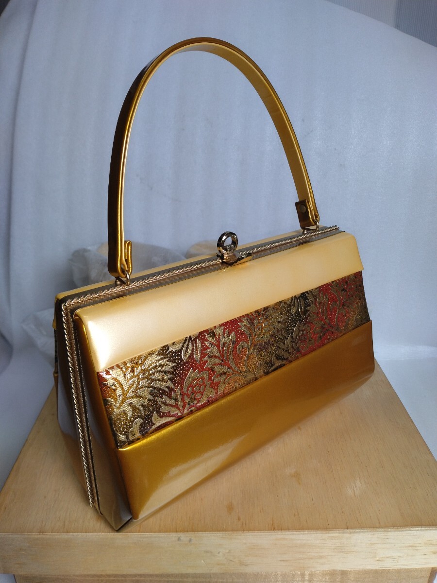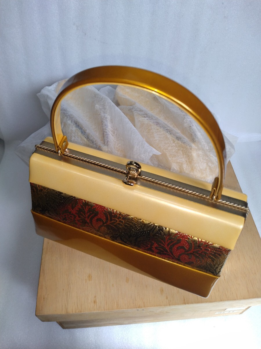 K987【中古良品】 着物 和装 草履 和装バッグ セット ゴールド 本革製品 木箱 | ||