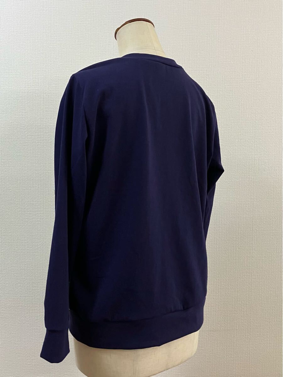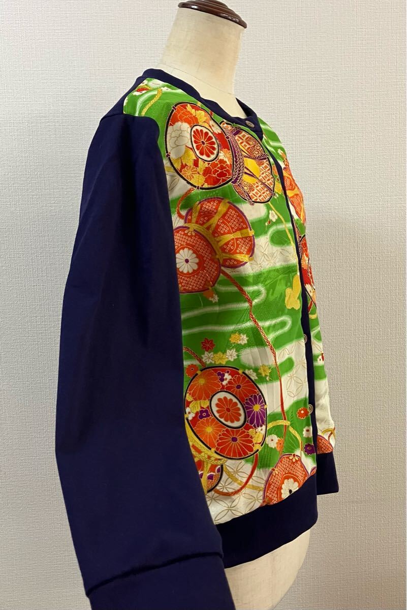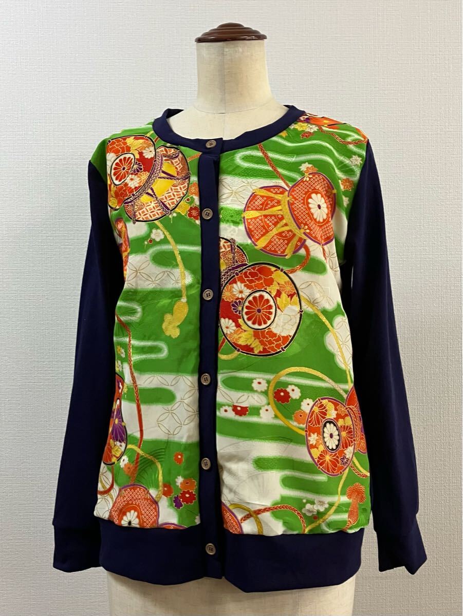 お色は紫系コットン素材と、黄緑やオレンジ、紫、金等の着物生地との切替カーディガンです。袖はまくってもずり落ちにくいよう二重仕立て、前にボタンが6個付いてます。コットン素材は深い紫系のお色でしっかりめの生地質です。透け感なし伸縮性あり(着物生地はなし)