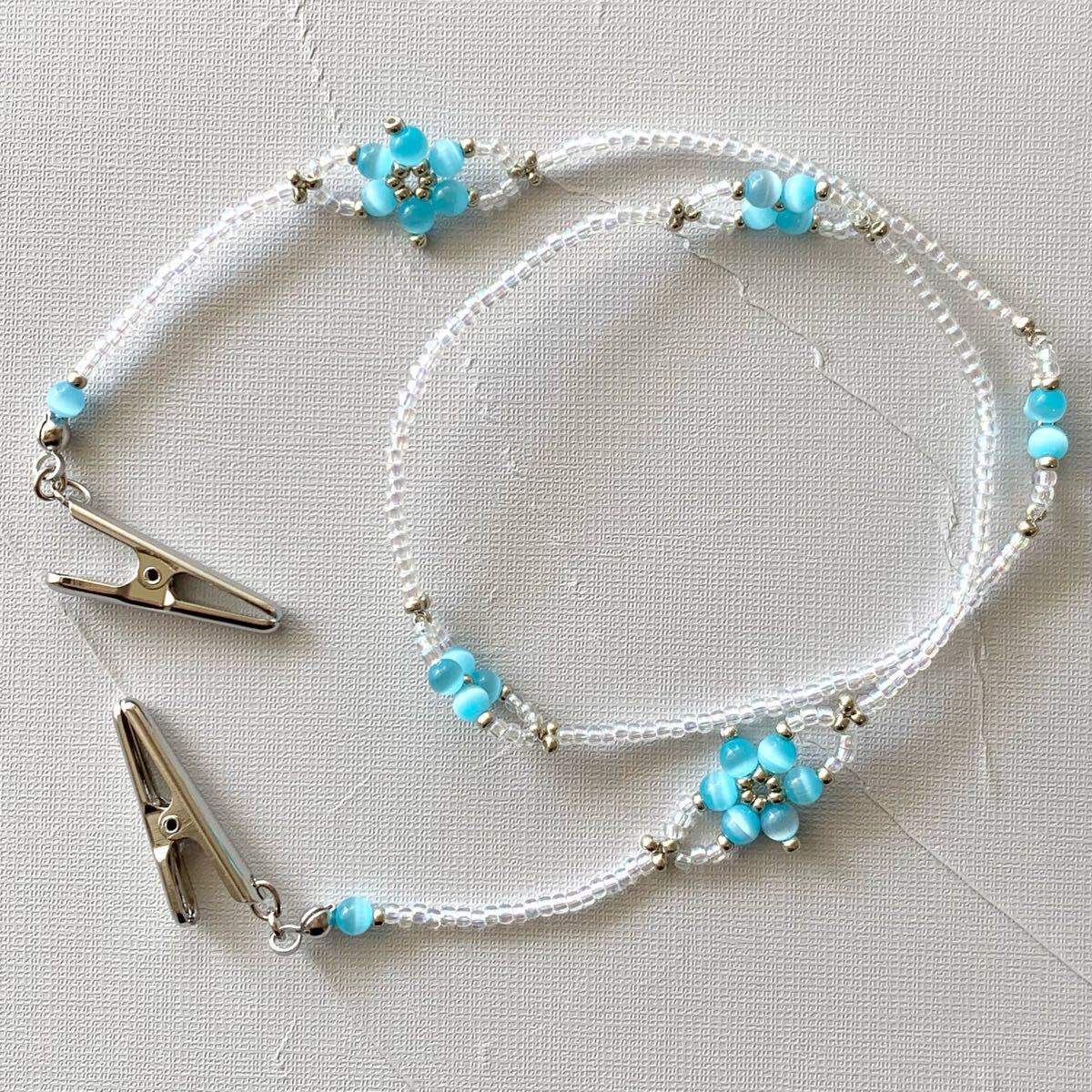 材料/人工キャッツアイ、丸小ビーズ、ハットクリップ、テグス、他