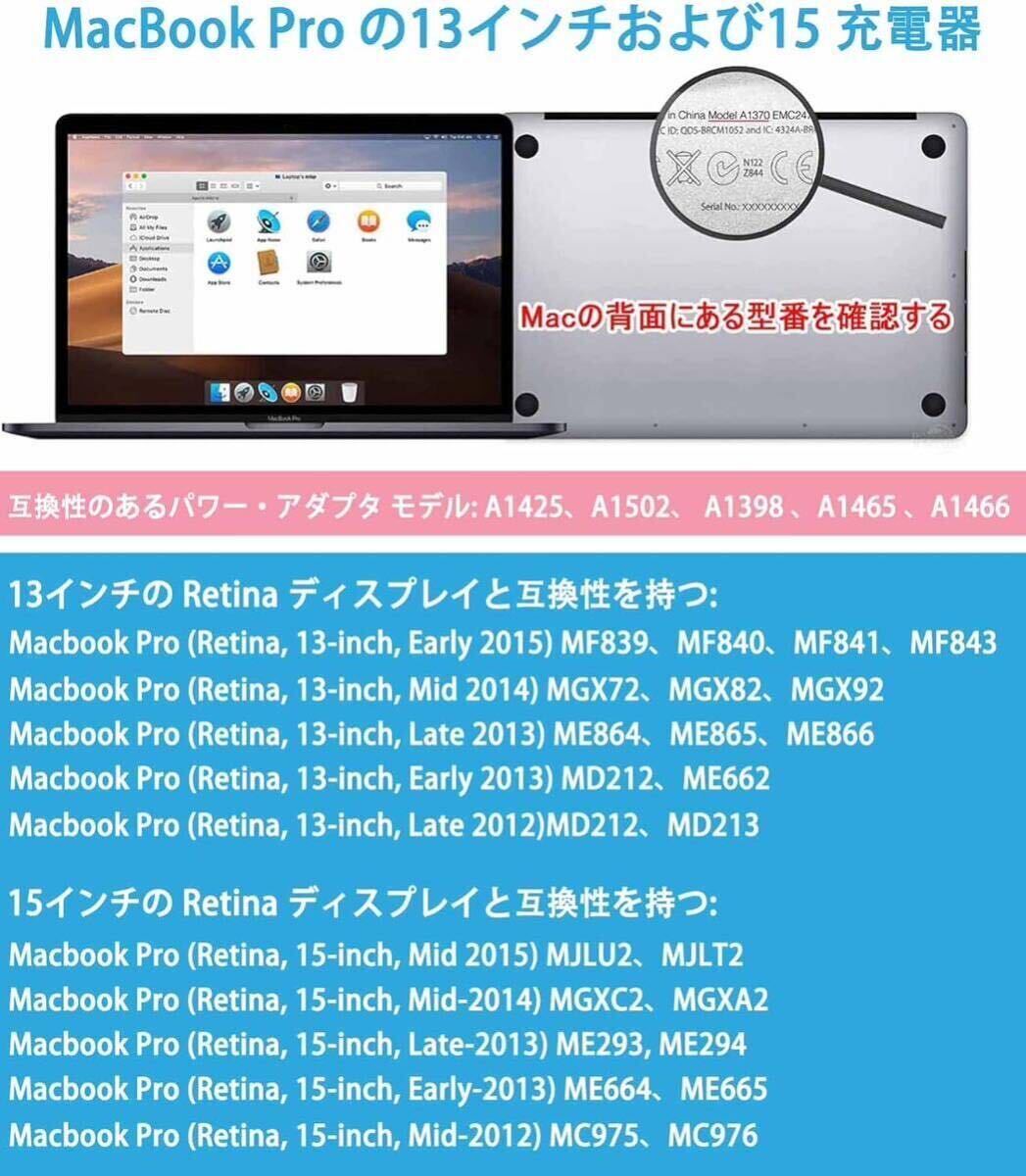 入力:AC 100-240V、50-60Hz;OUTPUT: DC 20.5V-4.05A,Power 85W T 字コネクタ MacBook Pro モデルと互換性があります:2012年半ば以降にリリースされたMacbook Pro 15/17イインチと 互換性。モデル番号: A1286 、A1398、 A1425、 A1502 以下のように、2012年半ば以降にリリースされたTチップ付きMacBook Pro Charger 85W Mag 2 T型 と互換性があります。 2012年半ば以降にリリースされたMacBook Pro 13/15/17 インチ ★適合機種★ A1278、A1502、A1344、A1465、A1502、A1425、A1435、A1466、A1398、A1424、ME293、ME294、ME64, ME665, MC975、MC976、MD506、MJLU2、MJLT2、MGXC2、MGXA2 優れた素材:最高品質の素材で製造されたmacbook pro充電器は、ラップトップを保護する複数のスマート機能を備えており、充電器のほつれや劣化を防ぐのに役立ちます。 交換用充電器は、過電流、過電圧、過負荷、短絡保護、自動回復を防ぐための複数のインテリジェント機能を含む、最高品質の素材とより耐久性のあるプレミアムコンポーネントから製造されています。