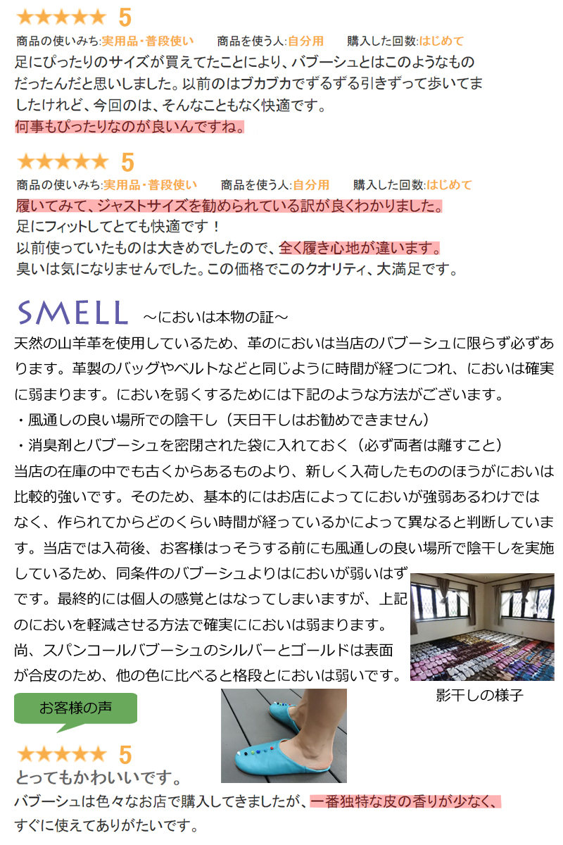 当店のバブーシュはすべてモロッコの職人さんが手作りで作製したものです。工場で作った大量コピー製品ではないので小さな傷・汚れ、染色の際のむら、ボンドのはみだし、ボールペンの跡、若干のサイズの誤差、同じデザインでも左右非対称、入荷時によって画像とのデザインやスパンコールの色の違いなどのハンドメイド感についてはご了承のうえ、ご注文をお願いいたします。上記のことを踏まえての価格設定となっております。