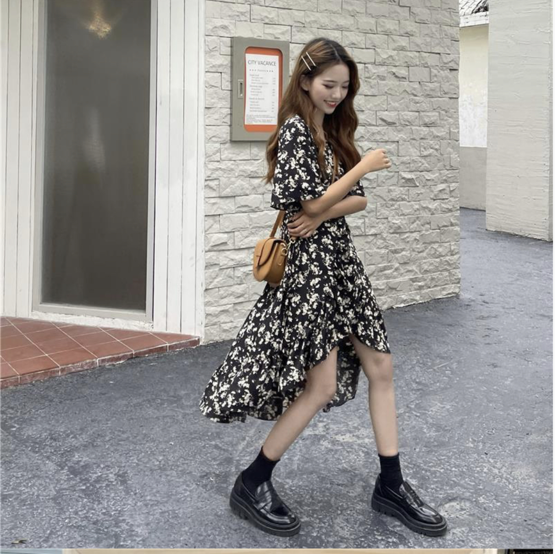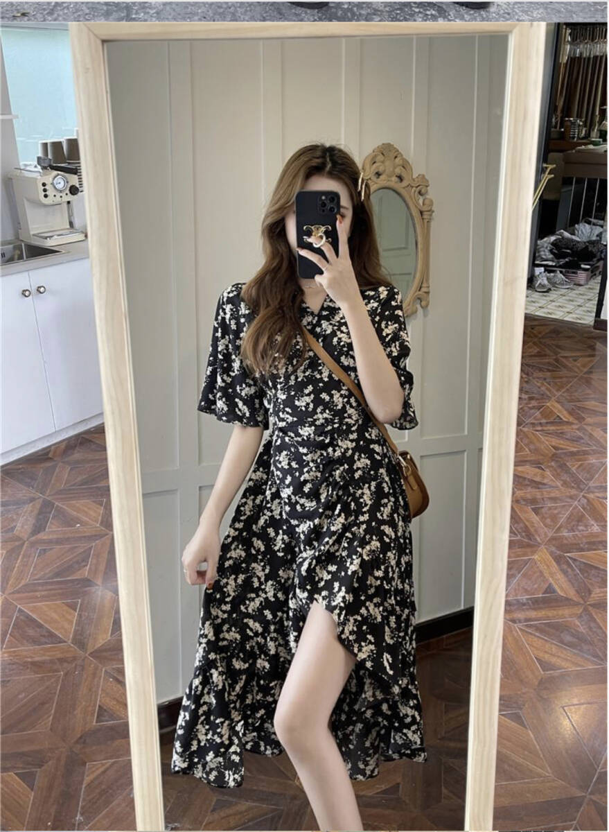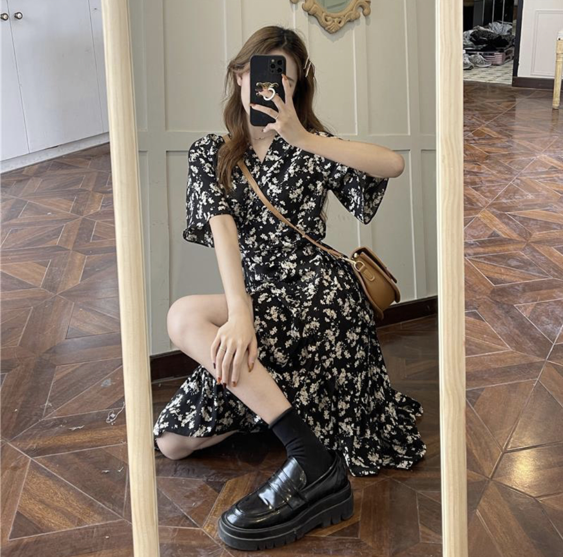 【新品】ワンピース 花柄 プリント ブラック 半袖 Vネック L