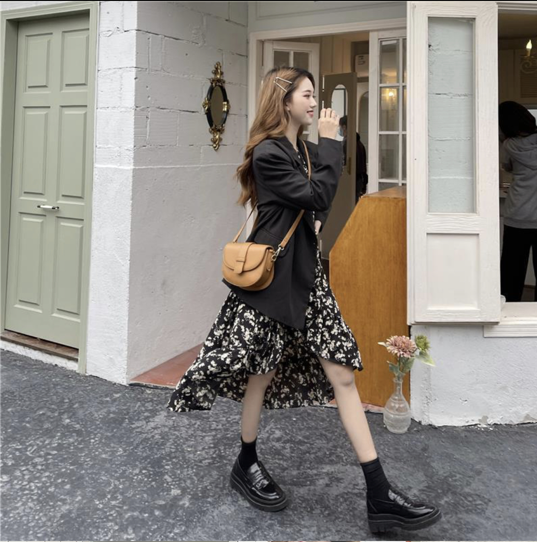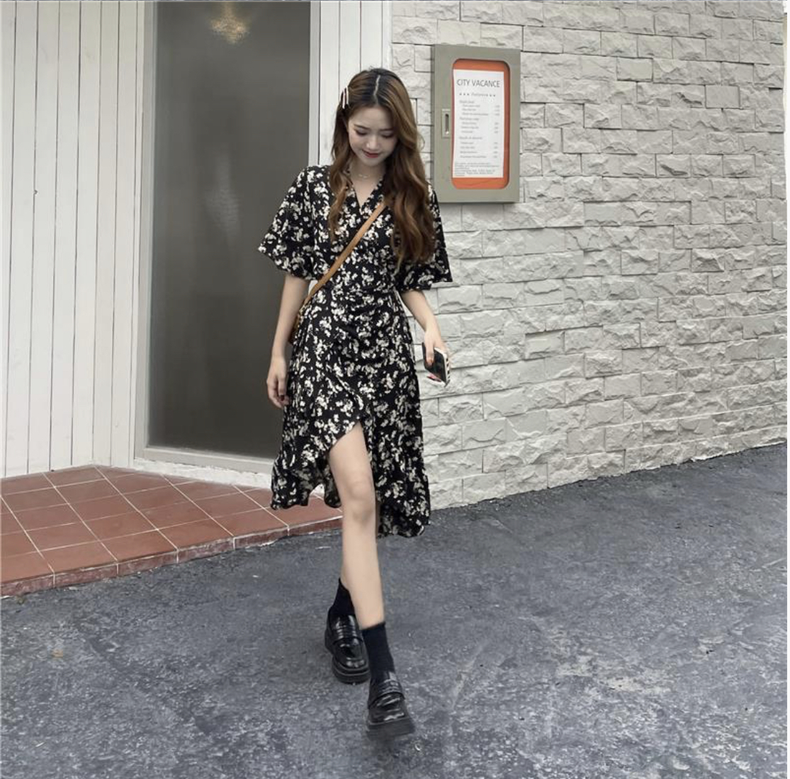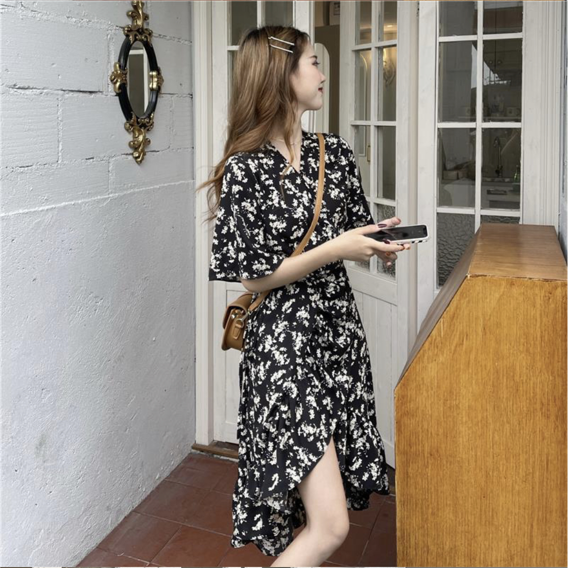 【新品】ワンピース 花柄 プリント ブラック 半袖 Vネック L