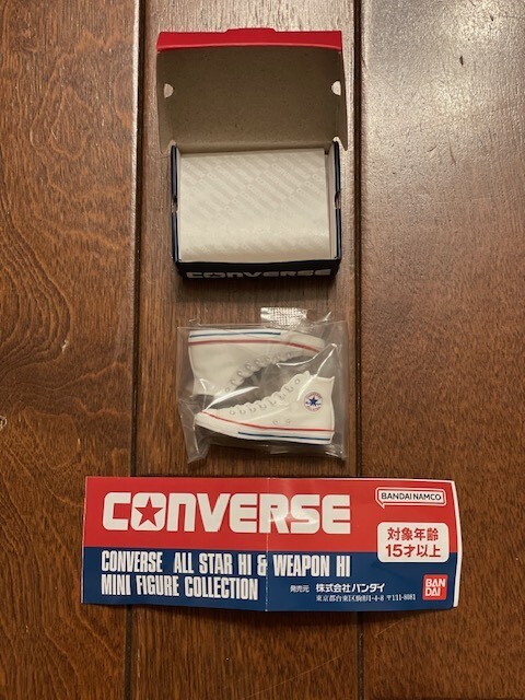 バンダイから発売のコンバースミニフィギュアコレクション全7種のうちALL STAR HI オプティカルホワイト」になります。500円ガチャだけあって小さいながら精巧な作りになっていて、箱まで精巧な作りとなっています。今回販売分の外袋は最初から閉じられていません。リスト付きになります。