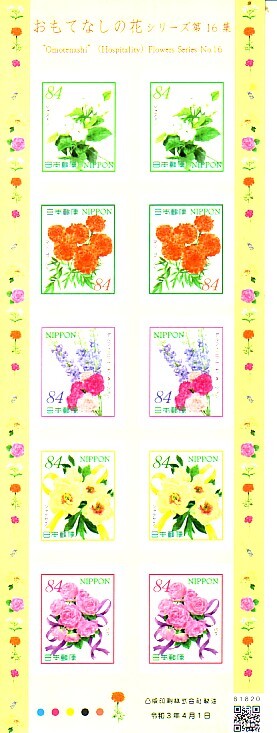 「おもてなしの花 シリーズ第16集」の記念切手です(84円切手X10枚)。送料は普通110円(郵送 普通郵便)になります。