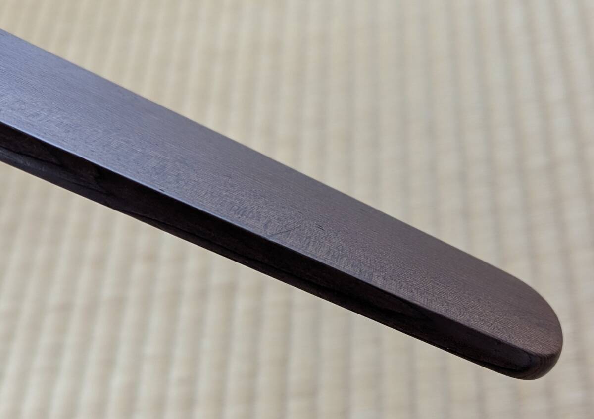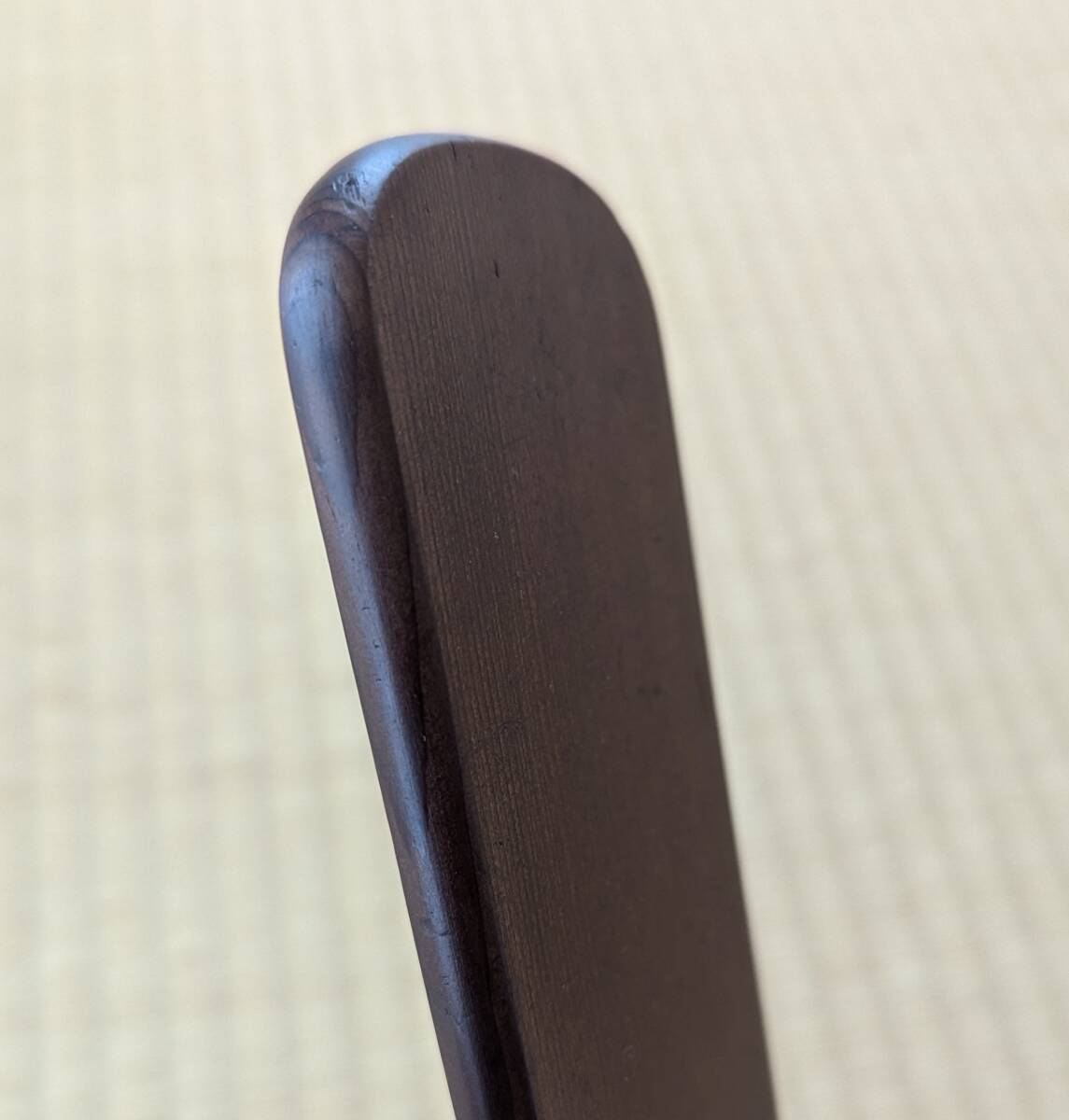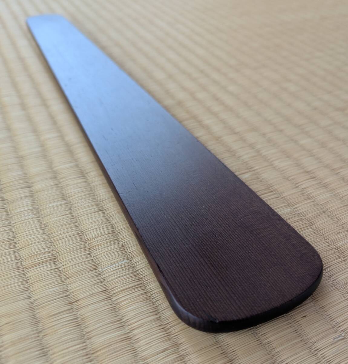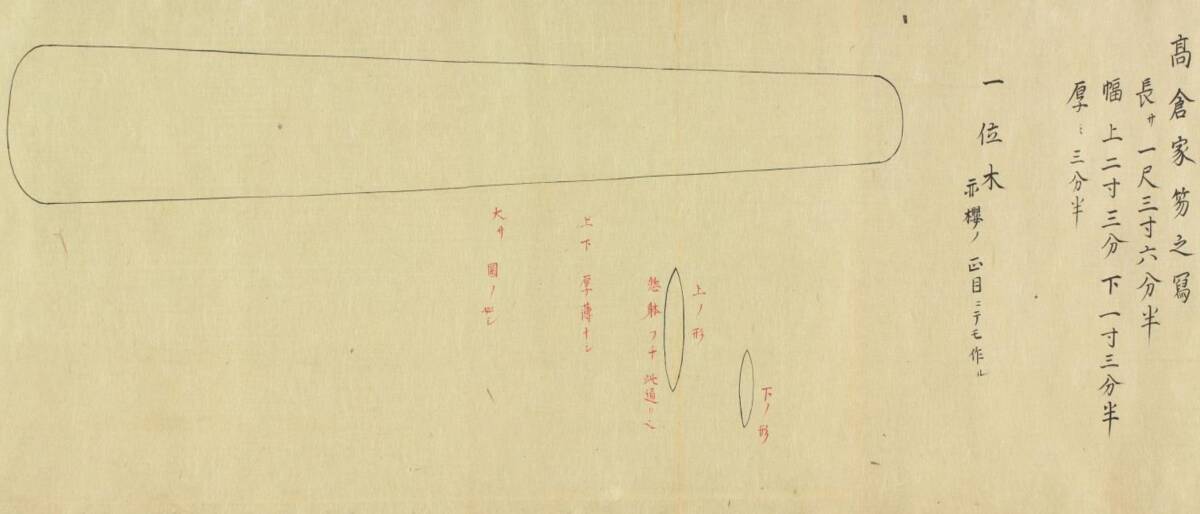 まず、高倉家伝来の笏をモデルにして作られた方の寸法ですが、全長39㎝・上幅6.3㎝・下幅3.7㎝・厚さ9㎝となっており、なるほど『古笏図』の「高倉家笏之写」に記されたデータにほぼ近い数値を示しています。形状も蛤形で一致しています。