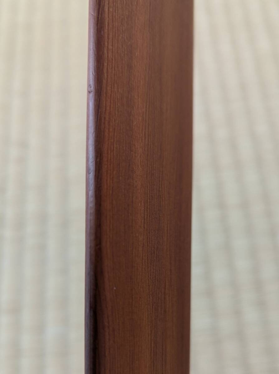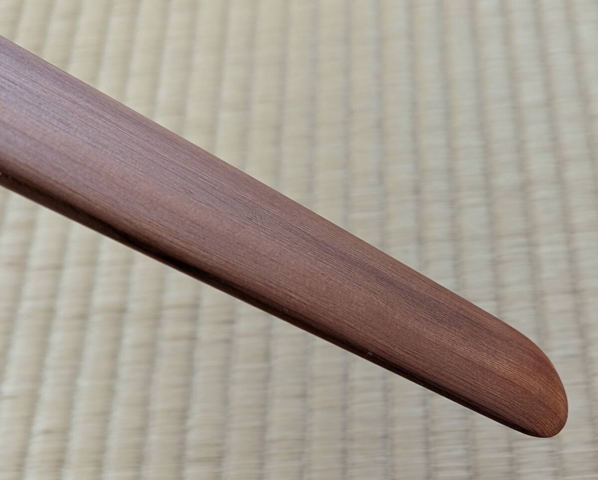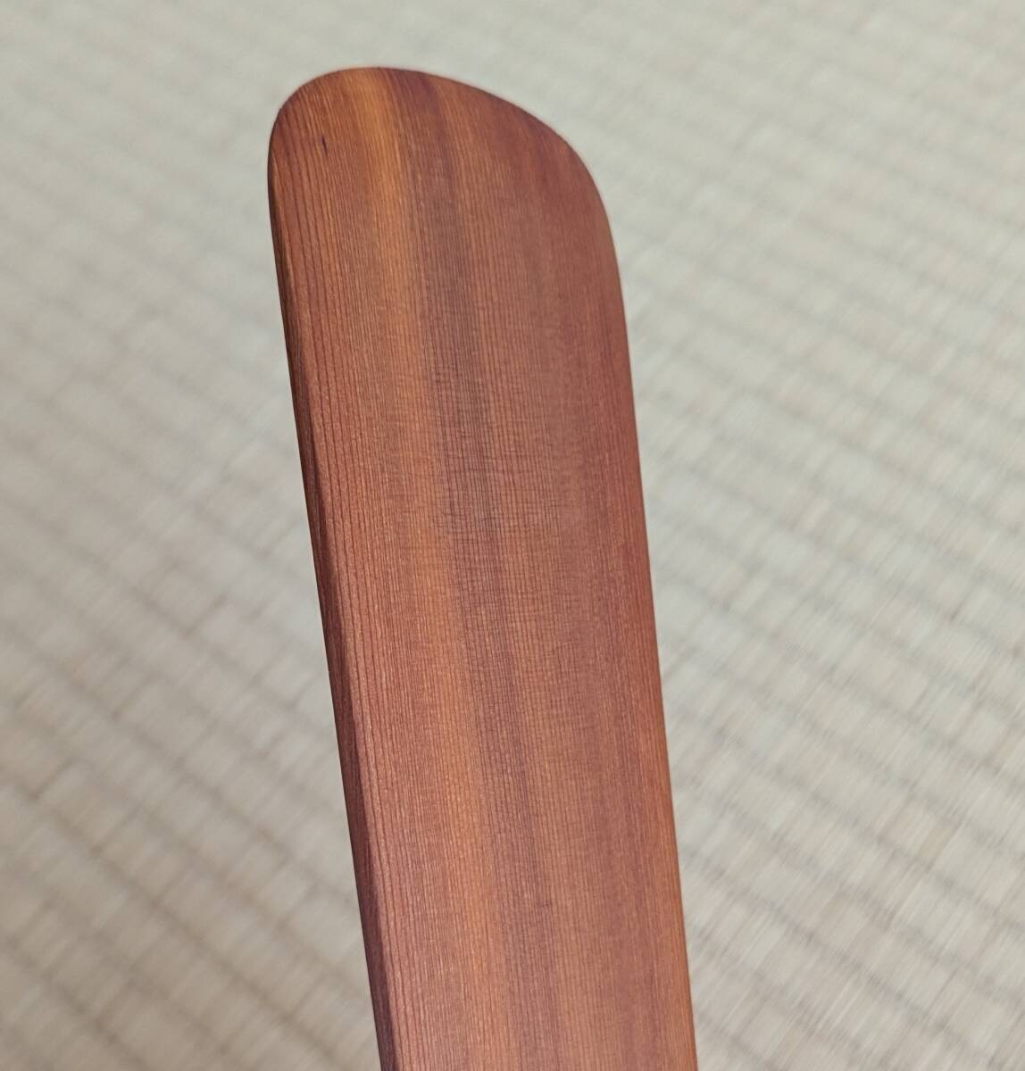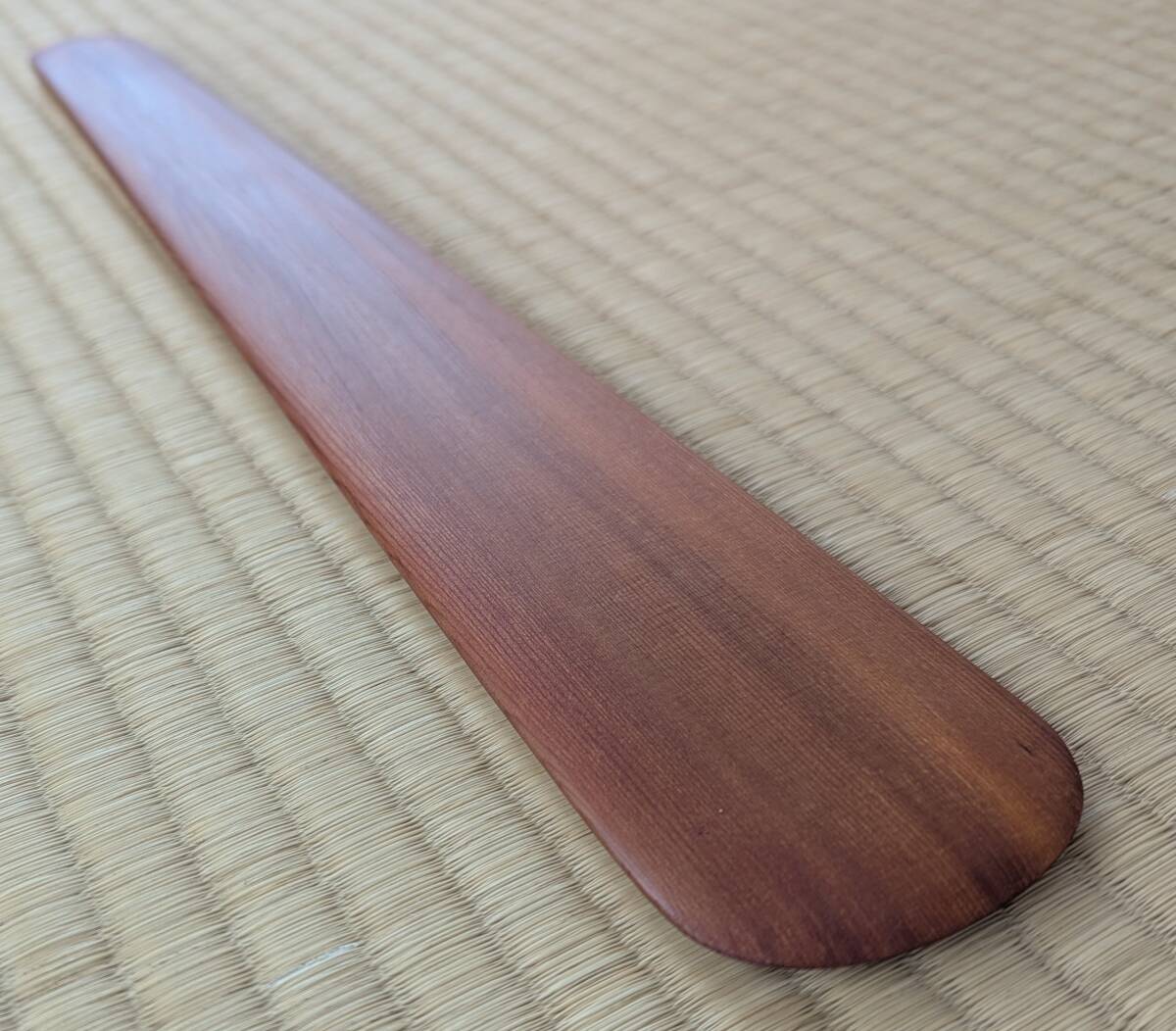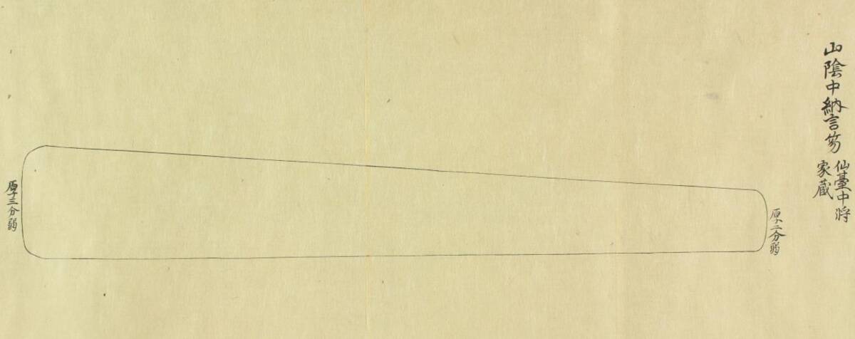 次に、山陰家伝来の笏をモデルにした方の寸法ですが、全長39㎝、幅6.7㎝、幅3.8㎝、厚さは8㎝―6.5㎝と手元が薄くできており、上の方に向かって厚みが増しています。『古笏図』の「山陰中納言笏」には寸法は明記されておらず全体の形状を写し取っただけの記載ですが、確かに上部と下部とでは厚みが異なっているのが分かります。形状も平形で一致しています。上部と下部とで厚みが異なる笏は、私も伊勢の神宮ほかいくつかの古社で見かけたことがあります。古い笏の特徴の一つなのでしょう。