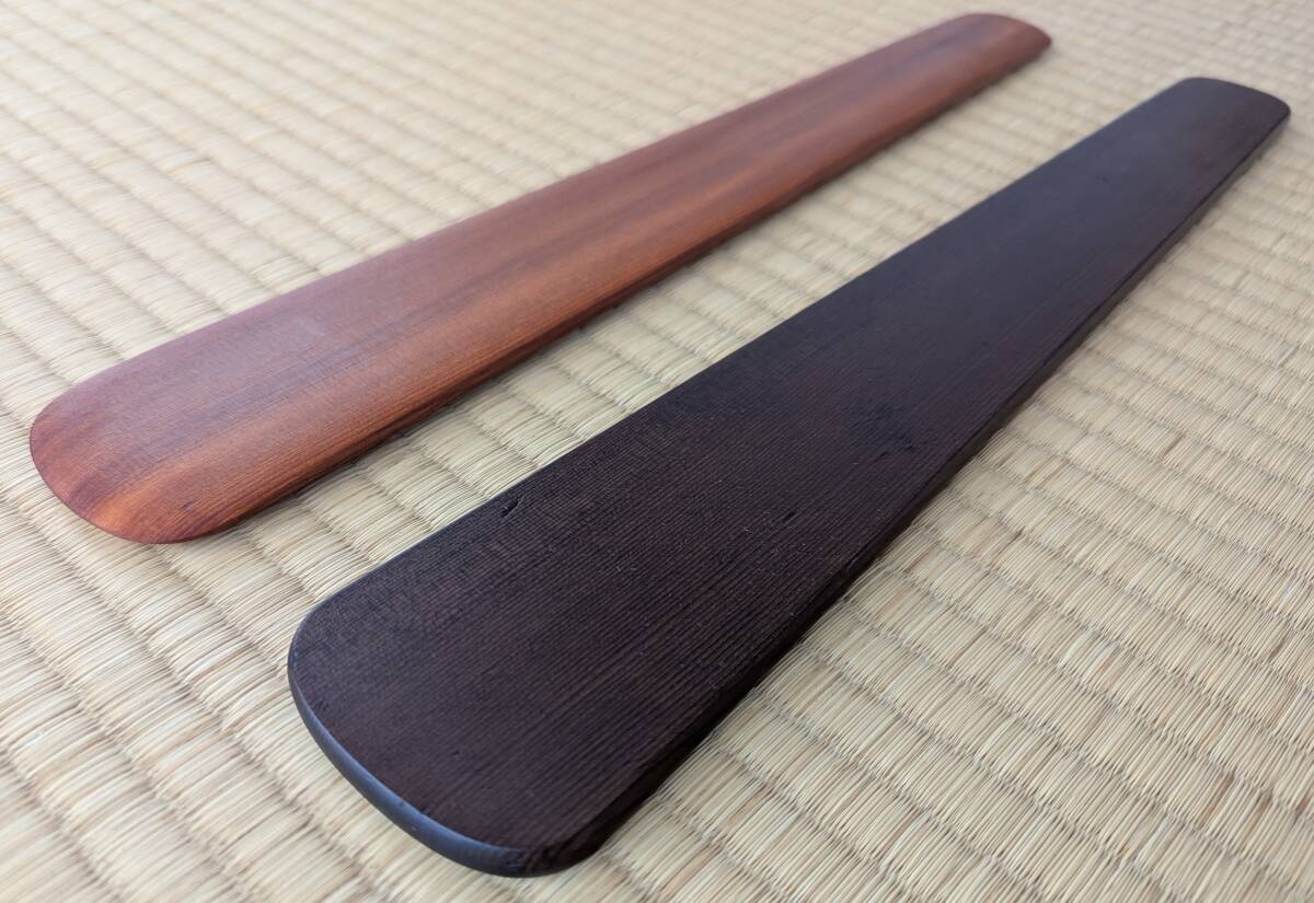 非常に丁寧に作られた笏です。材質は櫟(一位)と判断されます。また、この2握は『古笏図』に出てくる高倉家と山陰家に伝わる笏をモデルに作られたとのことです。