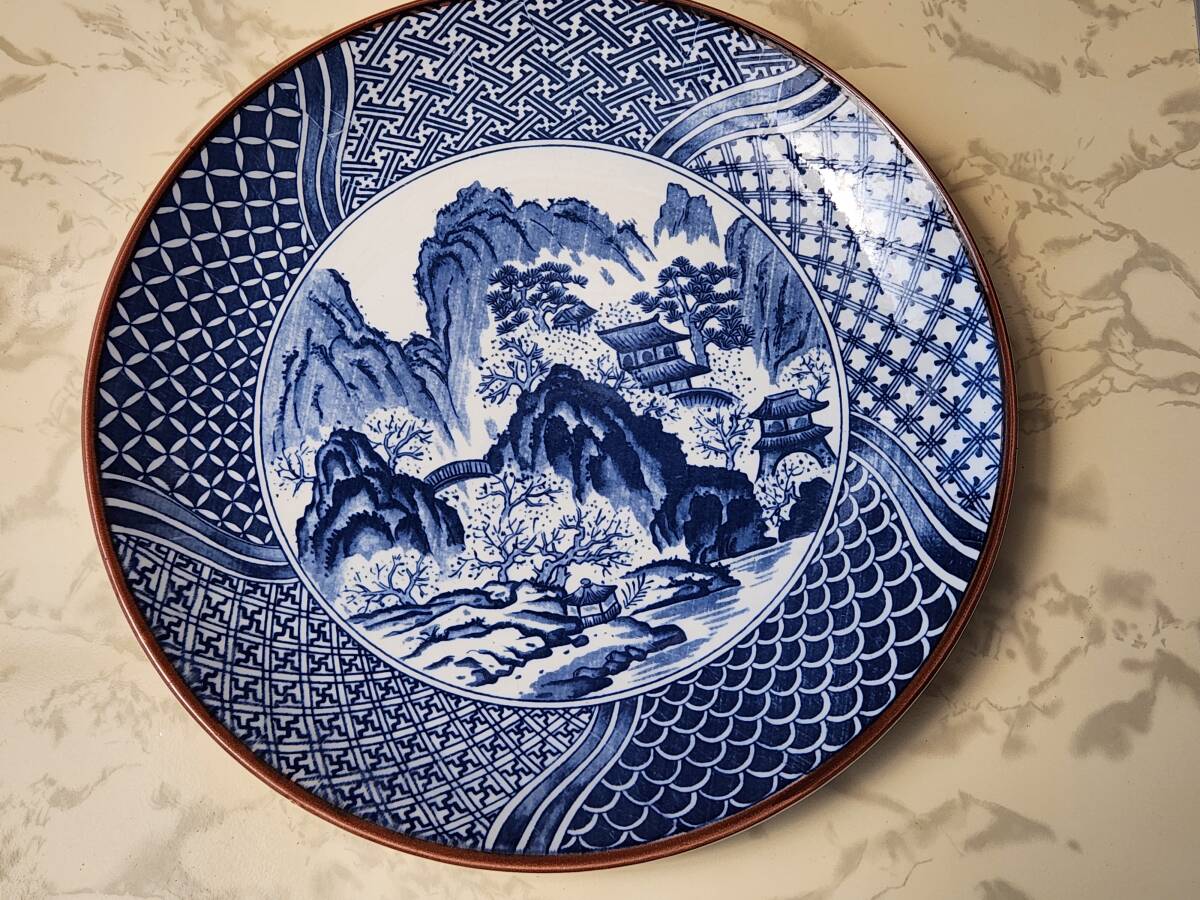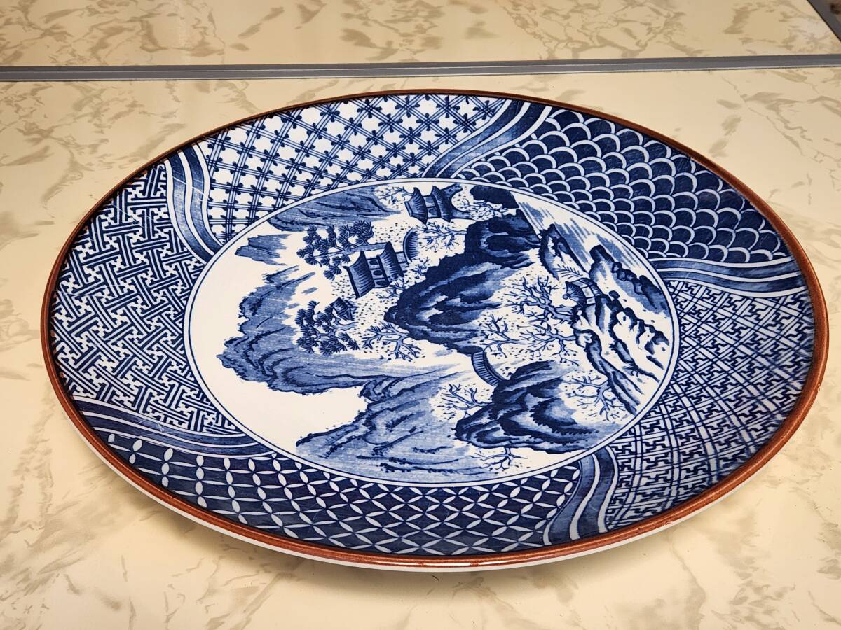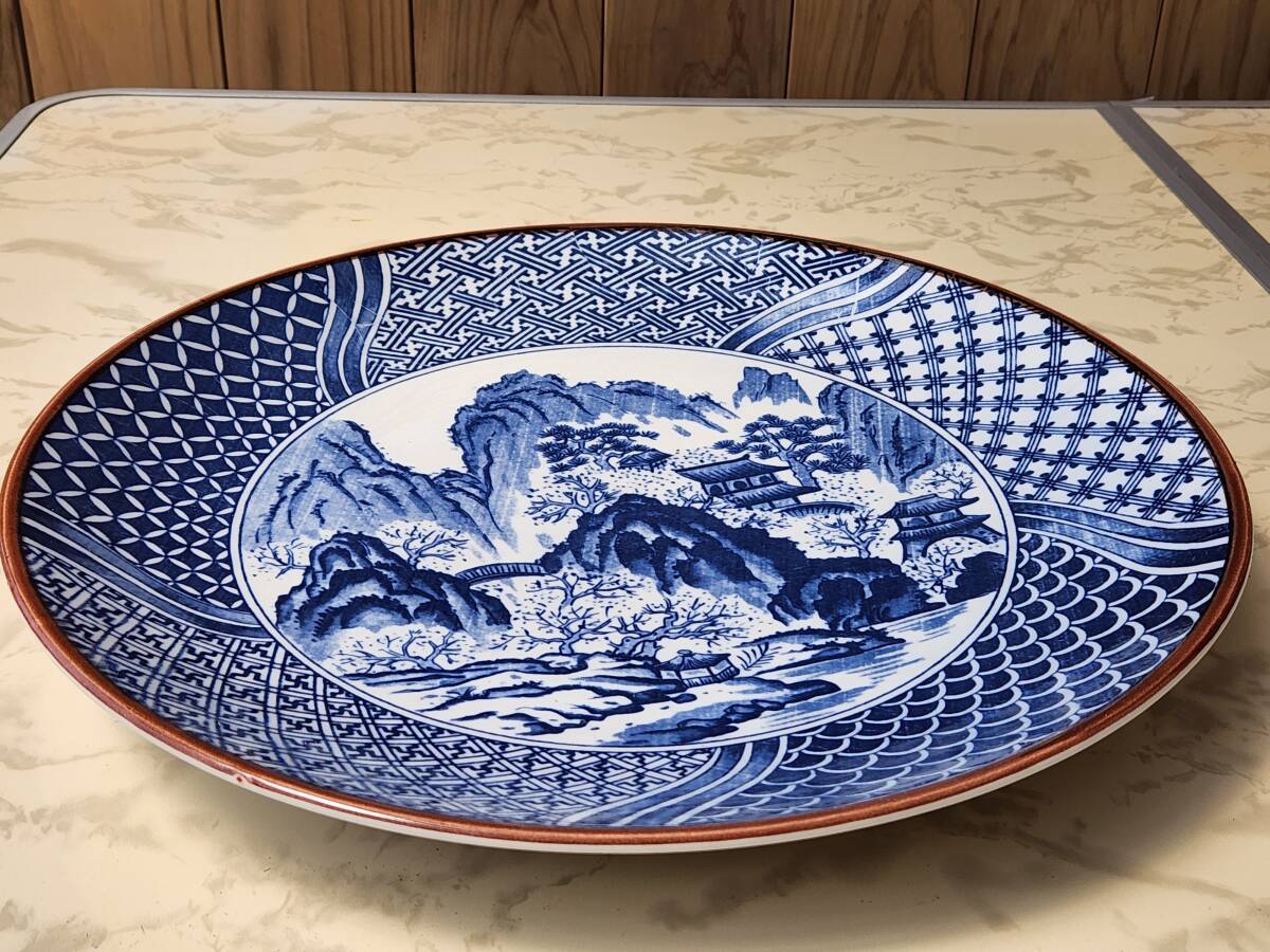 宴会の料理を盛る為の落ち着いた山水画の大皿となります。