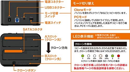 「玄人志向 2台搭載 2.5型 & 3.5型 クローン機能付き SATA HDD / SSDスタンド(USB3.2 Gen1接続)SSD移行ソフト」▼4988755061865▼(商品説明)・ブラック KURO-DACHI/CLONE/ESKP/MU3・SSDやHDDをクローン&消去!クローン機能付き外付SSD/HDDスタンド・データ削除・SSD移行ソフト付き・PCレスのエラースキップクローン,データ消去ができるドッキングステーション・AOS社製「ターミネーター10Plusデータ完全抹消BIOS/UEFI版」,「ファイナルハードディスク/SSD入れ替え(v16)」2ソフトのライセンスキーを同梱・モード切替スイッチ,ボタンの2度押しによりクローン開始の誤操作を防止説明 【搭載可能ドライブ】2.5型&3.5型 SATA I II III SSD および HDD<br> 【対応USBポート(PC側)】Type-A形状 / USB3.2 Gen1 USB3.1 Gen1 USB3.0 USB 2.0 【対応OS】Windows11,10,8.1 【本体サイズ・重量】幅121 x 高さ99 x 奥行75 mm,約320g 【方法・マニュアル】玄人志向Webにて配信 【期間】1年 ※PC起動時のHDDの電源ON/OFFはPC設定に従います。 ※新規ドライブを取り付けた場合など、ドライブのフォーマットが必要です。 ※PCから取り外す前に、OSからドライブの取り外し処理を行ってください。 ※ドライブの入替,PC/クローンモード切替時は本製品の電源をOFFにして操作ください.
