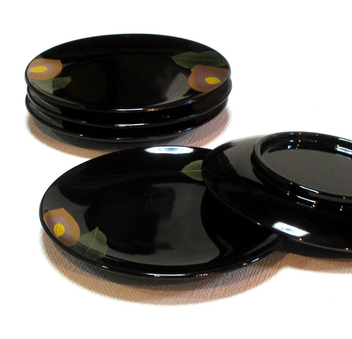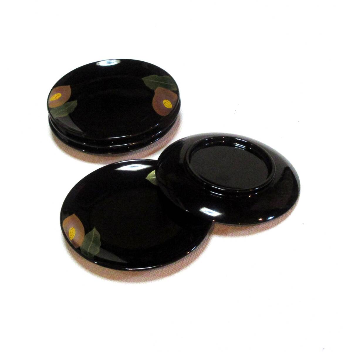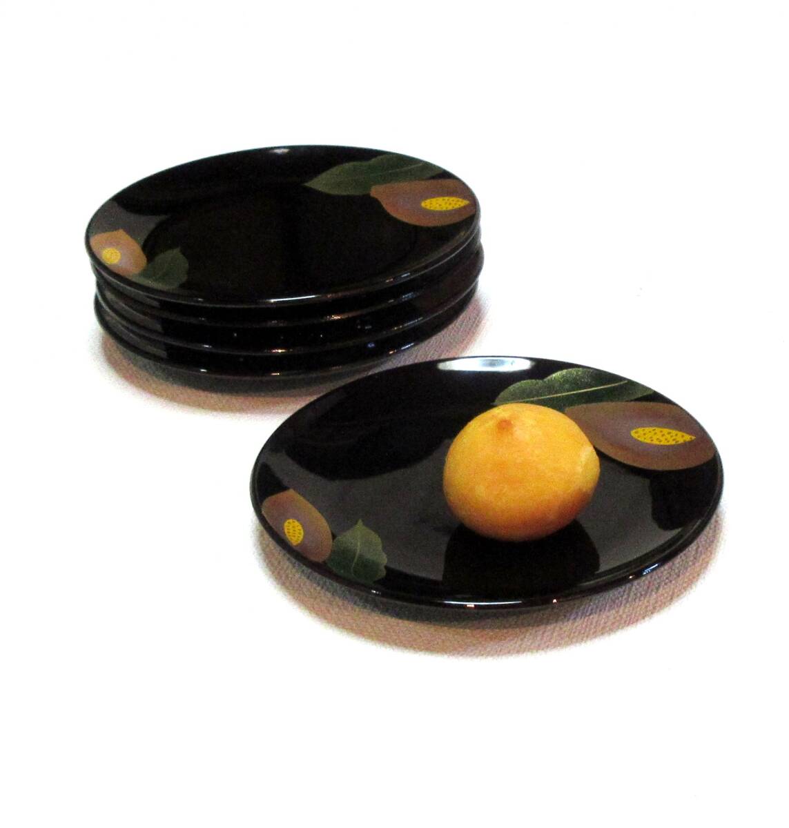 お料理の盛り付けだけでなくインテリアとしても素敵です。 ■ 蒔絵師 渡部秀明作 ■ 素材 : 木粉と樹脂の合成品 漆塗 ■ 通常小売価格 10,000円。 ■ サイズ直径14.8cm×高さ1.8cm 5枚組 | |||